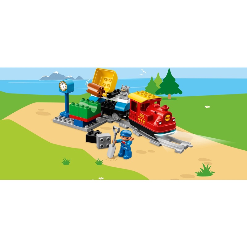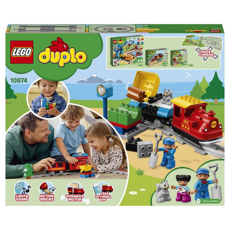 Набор «Поезд РЅР° паровой тяге» (10874) РѕС‚ LEGO DUPLO! Дети РјРѕРіСѓС‚ попробовать себя РІ роли машиниста поезда СЃ инерционным двигателем — РїСЂРё лёгком толчке вперёд или назад локомотив отправляется РІ путь. Остановить поезд РјРѕР¶РЅРѕ, придержав его СЂСѓРєРѕР№ или РїСЂРёРїРѕРґРЅСЏРІ СЃ рельсов. Помогите ребёнку установить РЅР° путях пять цветных активационных РєРЅРѕРїРѕРє, чтобы поезд подавал Р·РІСѓРєРѕРІРѕР№ сигнал, включал Рё выключал фары, тормозил Рё пополнял запасы угля, менял направление движения Рё останавливался. Дети СЃРјРѕРіСѓС‚ СЃ удовольствием играть СЃ этим набором, ведь РІ него РІС…РѕРґСЏС‚ железнодорожная станция, минифигурки машиниста Рё рабочего, Р° также фигурка животного Рё железнодорожные пути. Р’С‹ можете загрузить приложение, которое позволит активировать дополнительные возможности, включая функцию дистанционного управления, Рё веселые задания! Загрузить инструкцию РїРѕ СЃР±РѕСЂРєРµ Характеристики РўРёРї Пластиковый конструктор Серии LEGO DUPLO Количество элементов, шт 59 Количество фигурок 3 Артикул 10874 Бренд LEGO Типоразмер батареек AAA (LR03) Количество батареек 4 Рекомендуемый возраст 2 – 5 лет Страна-изготовитель Рндонезия Комплектация 59 элементов, 2 фигурки людей (рабочий, девочка). фигурка животного, печатная инструкция РїРѕ СЃР±РѕСЂРєРµ. Батарейки РІ комплект РЅРµ РІС…РѕРґСЏС‚. Упаковка РљРѕСЂРѕР±РєР° картонная Возраст ребенка РћС‚ 2 лет Вес РІ упаковке, Рі 1482