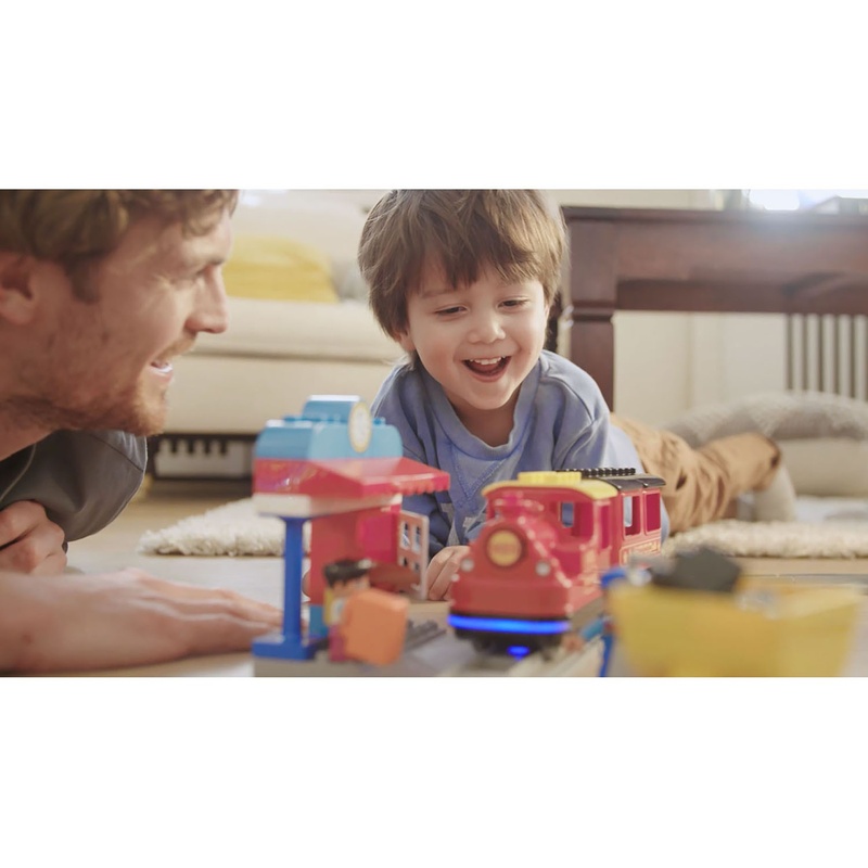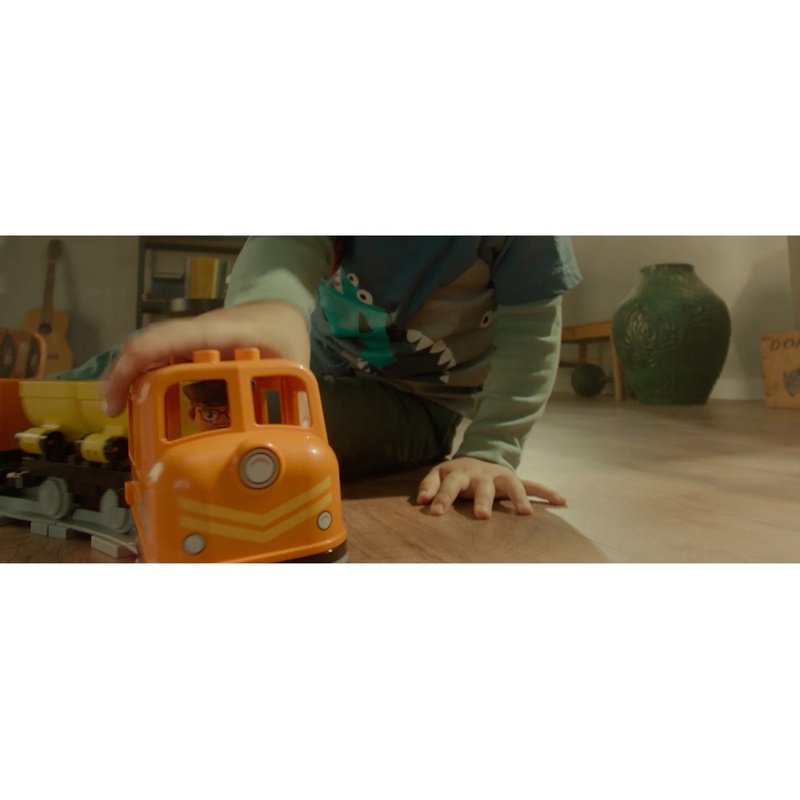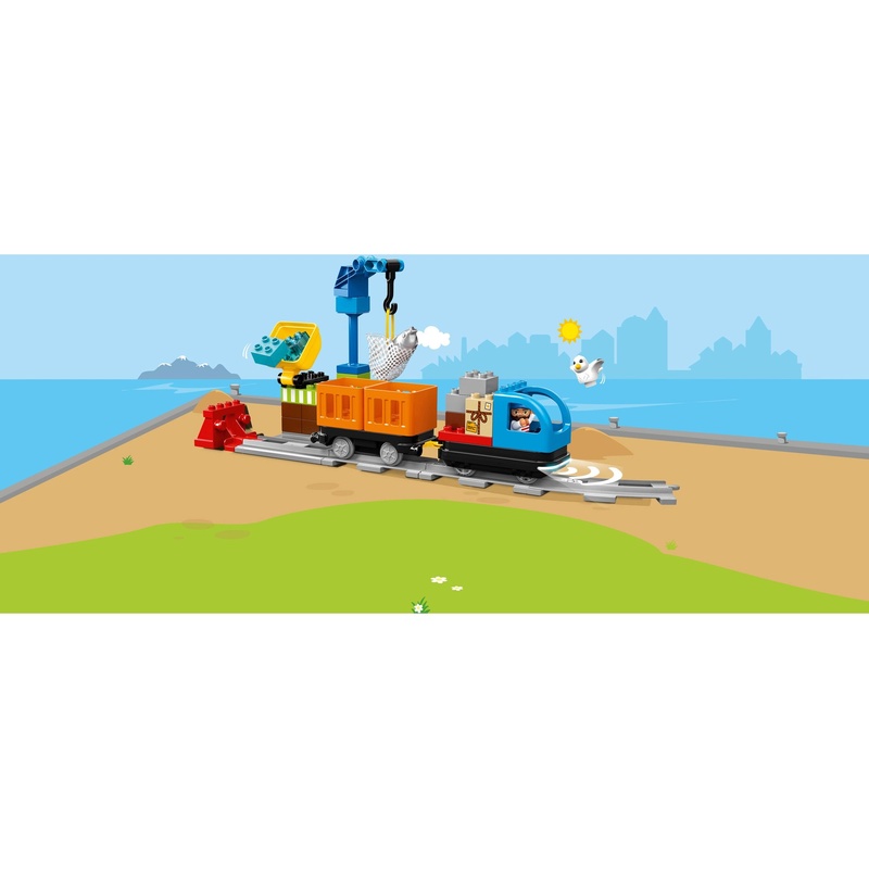 Набор конструктора Lego Duplo Грузовой поезд состоит из 105 деталей и включает 4 фигурки. С этим набором малыш от 2 до 5 лет сможет собственными руками собрать игрушечную железную дорогу. Яркий оранжевый поезд умеет ездить прямо по рельсам. Для этого достаточно нажать ручкой сверху на его корпус. Повторив движение, вы остановите поезд. Но это еще не все в состав набора входят 5 разноцветных кнопок, которые активируют в поезде множество функций жёлтая – звук; красная – остановка; белая – свет; синяя – временная остановка для заправки; зеленая – смена направления. Достаточно положить такую кнопку между рельс, и, когда поезд над ней проедет, его датчики распознают цвет кнопки и соответствующую команду. Помимо этого для управления данным поездом есть специальное приложение, которое вы найдете в App Store или Google Play. С помощью него можно выбирать направление движение поезда (вперед, назад), останавливать и запускать поезд, активировать свет и звук. Дополнительные детали разнообразят игру. Из них вы сможете собрать грузоподъемный кран, корабль и кафе. Кран собирается из синих деталей, он оснащен кабиной водителя, в которую можно усадить фигурку, и манипулятором с крюком на конце, с помощью которого можно захватывать грузы. Лодка собирается из желтых, голубых и красных деталей. На ее борту можно поставить фигурку или груз. А кафе будет радо предложить своим посетителям горячее какао, шоколад, свежие булочки и множество других вкусностей. Крупные кубики удобно брать маленькой детской ручкой, а еще их невозможно проглотить. Сборка конструктора укрепит моторику рук, разовьет логику ребёнка. Набор сочетается с другими наборами серии. Внимание Для работы игрушки требуются 4 батарейки ААА, в комплект не входят! С корабликом можно играть в воде, а вот поезд и батарейки класть в воду категорически нельзя.