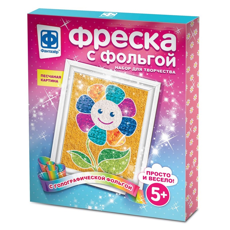 Фреска из фольги, блёсток и песка - увлекательный вид творчества, который понравится любому малышу. И если с песком и блёстками все знают как работать, то фольга - это новый материал. Работать с ним легко - отдели защитный слой с одной детали картинки и заполни его фольгой. Важно! Фольгу нужно прикладывать на клеевую основу серой стороной. Затем заполняем другие детали песком и украшаем блёстками, и шедевр готов! Фреска развивает у ребёнка логическое мышление, чувство прекрасного, усидчивость, абстрактное и логическое мышление, сообразительность, мелкую моторику и координацию движений. Фреску, созданную своими руками, ребёнок подарит друзьям, близким или украсит ей детскую комнату. Размер картинки: 134х174 мм. В набор входит: фольга, цветной песок, блестки, двухслойная основа, объёмная рамка, деревянный стик, кисть, шаблон-инструкция. Состав: кварцевый песок, металл, блестки, бумага, картон, кисть, дерево, пленка. Рекомендовано детям старше 5 лет.
