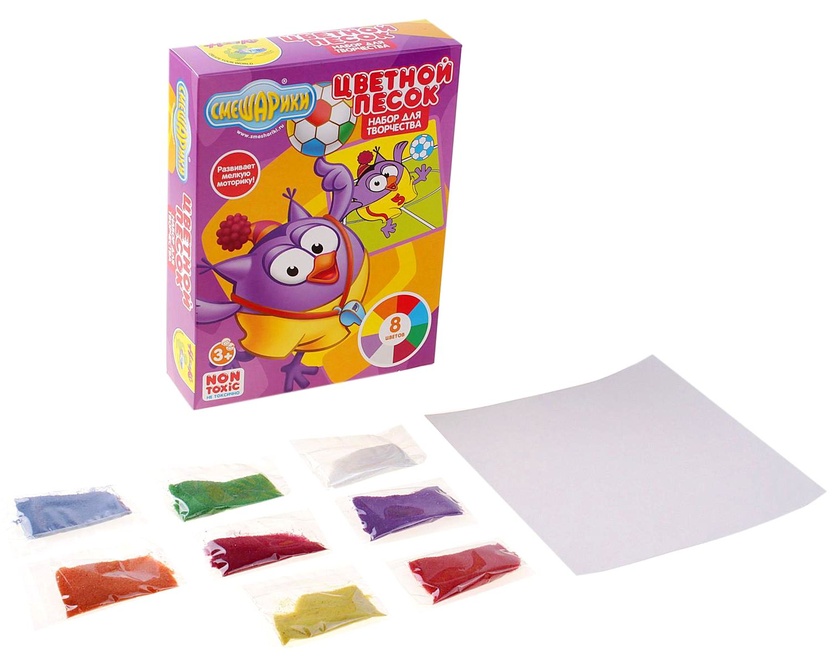 Нет в наличии Отсутствует84498 Набор-панно из песка Смешарики (в наборе картинка-трафарет, 8 пакетиков цветного песка)