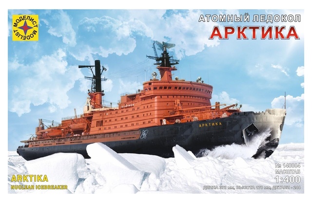140004 флот Атомный ледокол "Арктика" (1:400) Атомный ледокол «Арктика», СССР, 1975 год. Ни одна страна в мире, кроме России, не имеет атомный ледокольный флот. Атомный ледокол «Арктика», был введен в состав ледокольного флота в 1975 году, вслед за первым атомоходом «Ленин» 1959 года. «Арктика» была построена на Балтийском заводе в Ленинграде и стала головным кораблём серии проекта 1052. Позднее на Балтийском заводе было построено ещё 5 атомных ледоколов этого проекта: «Сибирь», «Россия», «Советский Союз», «Ямал» и «50 лет Победы». С 1975 года «Арктика» служила для проводки судов по Северному морскому пути. В период с 1982 по 1986 год ледокол «Арктика» носил имя «Леонид Брежнев». Существует версия, что из-за опечатки в постановлении это имя было присвоено «Арктике» вместо строящегося ледокола. В 1977 году ледокол «Арктика» стал первым в истории кораблём, который достиг Северного полюса. Под командованием капитана Ю.С. Кучиева ледокол вышел из Мурманска 9 августа 1977 года. Сначала он взял курс к северной оконечности Новой Земли. Далее, миновав пролив Вилькицкого, «Арктика» вошла в море Лаптевых, где повернула на север. 17 августа, преодолев мощный ледяной покров Центрального полярного бассейна, где толщина льда доходила до трёх метров, корабль достиг географической точки Северного полюса. За 7 суток 8 часов ледокол преодолел 2 тысячи 528 миль. «Арктике» принадлежит еще одно уникальное мировое достижение: с 4 мая 1999 года по 4 мая 2000 года она отработала в плавании ровно год без захода в какой‑либо порт. С 2012 года ледокол исключён из состава флота и находится в Мурманске в ожидании решения о его дальнейшей судьбе. Возможно, он будет сохранен в качестве музея и научного и учебного центра. Технические характеристики: Водоизмещение 23 460 т. Длина 147,9 м, ширина 29,9 м, осадка 11 м. Мощность энергетической установки 75 000 л.с. Скорость 20 узлов. Автономность плавания 7,5 месяцев. Экипаж 150 человек.