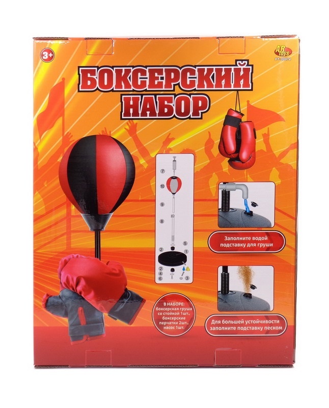 Набор Боксерский, в коробке. Комплектация: - боксерская груша (диаметр груши 20см) со стойкой (высота стойки регулируется от 80-110см), - боксерские перчатки 2 шт. - насос. Для устойчивости груши, наполните платформу стойки песком или водой. Дополнительно: Для детей от 3-х лет. Размер упаковки (д/ш/в): 39,5x52x13 см. Вес: 2,33 кг. Для работы батарейки не требуются.