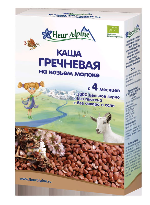 Каша Fleur Alpine Organic (Флёр Альпин Органик) гречневая на козьем молоке с 4 мес. 200 г Эта гречневая каша изготавливается из отборного цельного зерна с сохранением его природной питательной ценности, а также с добавлением сухого козьего молока. Каша не содержит сахара, соли и глютена, благодаря чему ею могут наслаждаться даже дети с индивидуальной непереносимостью данного вещества. Каши на козьем молоке – прекрасная альтернатива кашам на коровьем молоке. Подходят для малышей, которые не всегда хорошо переносят каши на основе коровьего молока. Каша очень полезна и питательна для растущего организма, к тому же она легко усваивается детским желудком и имеет восхитительный вкус и аромат. Состав: цельнозерновая гречневая мука*, сухое цельное козье молоко*, мальтодекстрин*. (* - органическое сельское хозяйство). · Не содержит сахара, соли. · Без глютена. · Содержит сухое козье молоко. · Энергетическая ценность в 100 г: 436 ккал. · Пищевая ценность в 100 г: белки - 16,2 г; углеводы - 63,5 г; жиры - 13,1 г; натрий - 123 мг. Условия хранения: · Хранить при температуре от 3 до +25°С и относительной влажности не более 75%. · После вскрытия хранить не более двух недель в сухом прохладном месте. · После каждого использования плотно закрывать пакет. · Срок годности: 18 месяцев. · Производство: Германия · Бренд · Fleur Alpine