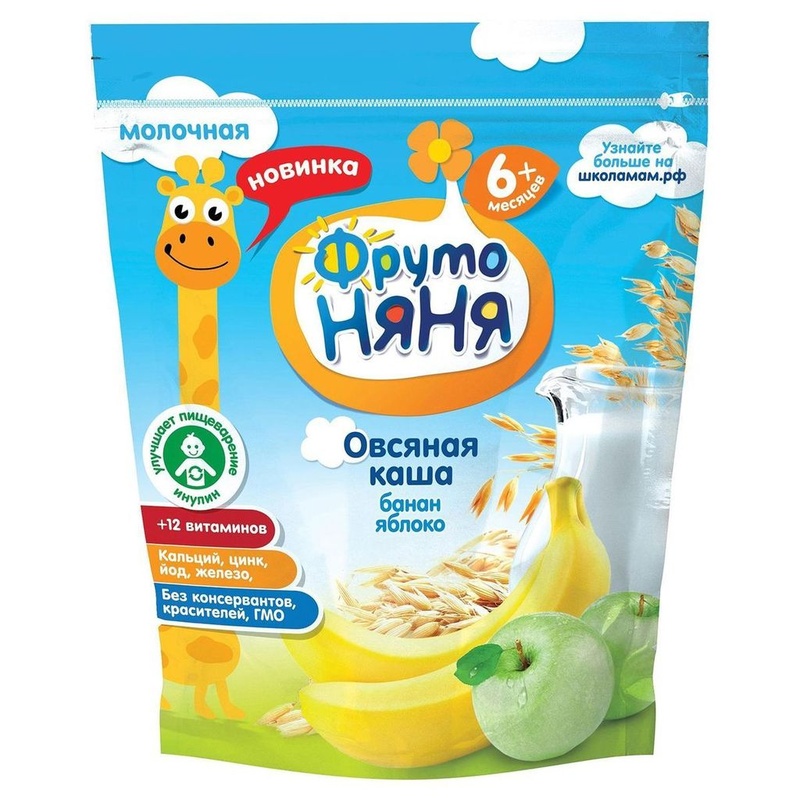ФрутоНяня каша овсяная с яблоками и бананами молочная быстрорастворимая, обогащённая пребиотиками, витаминами и минеральными веществами, для питания детей раннего возраста. Рекомендации по употреблению: рекомендуется детям с 6 месяцев. Начинайте вводить кашу постепенно с 1 чайной ложки готового продукта. Рекомендуемое количество порций каши – 1-2 в день. Для кормления используйте только свежеприготовленную кашу. Оставшаяся после кормления порция не подлежит использованию. Рекомендуемый суточный объем готовой каши к 6 месяцам составляет 150 г в сутки, к 8 месяцам - 180 г, к 12 месяцам - 200 г. Допускается приготовление каши с использованием грудного молока, искусственной смеси, цельного, обезжиренного или частично разбавленного молока. При приготовлении каши необходимо строго соблюдать инструкции, указанные на упаковке. Дополнительные характеристики Особенности: не содержит консервантов, не содержит красителей, не содержит ГМО Условия хранения: при температуре до +25°с, с относительной влажностью воздуха не более 75%. Не подвергать воздействию прямого солнечного света. Срок годности: 12 месяцев. Срок годности после открытия: 20 дней в сухом прохладном месте (но не в холодильнике). После каждого использования упаковку тщательно закрывать. Состав Фруктовые и соки: банановое пюре Молочные продукты: сухое цельное молоко Зерновые: овсяная мука Концентраты: концентрированное яблочное пюре Минералы: железо, цинк, йод, натрий, кальций Пищевые добавки: сахар, инулин Витамины: витамин C, витамин E, витамин А, витамин D3, витамин PP, витамин B1, витамин B2, витамин B5, витамин B6, витамин B7, витамин B9, витамин B12 Бренд: ФрутоНяня Страна-производитель: Россия Вес упаковки: 0.2 кг.