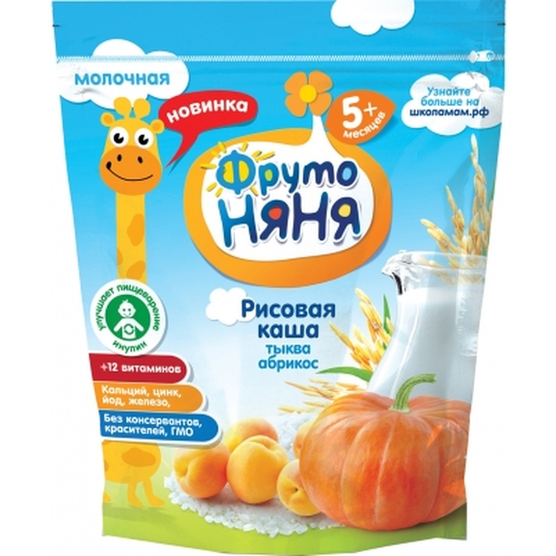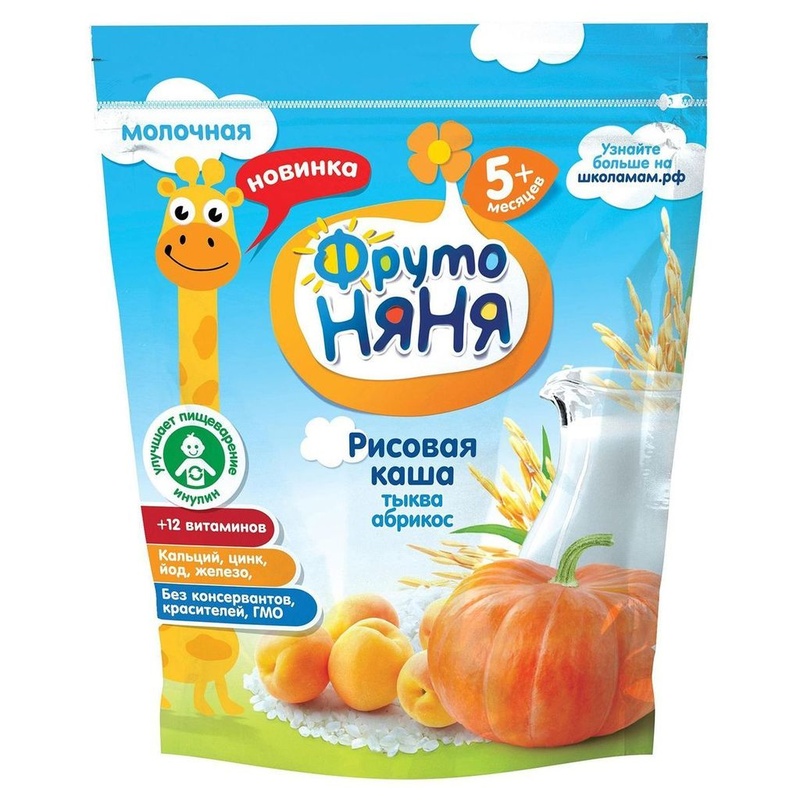 ФрутоНяня каша рисовая с тыквой и абрикосами молочная быстрорастворимая, обогащённая пребиотиками, витаминами и минеральными веществами, для питания детей раннего возраста. Рекомендации по употреблению: рекомендуется детям с 5 месяцев. Начинайте вводить кашу постепенно с 1 чайной ложки готового продукта. Рекомендуемое количество порций каши – 1-2 в день. Для кормления используйте только свежеприготовленную кашу. Оставшаяся после кормления порция не подлежит использованию. Рекомендуемый суточный объем готовой каши к 5-6 месяцам составляет 150 г в сутки, к 8 месяцам - 180 г, к 12 месяцам - 200 г. Допускается приготовление каши с использованием грудного молока, искусственной смеси, цельного, обезжиренного или частично разбавленного молока. При приготовлении каши необходимо строго соблюдать инструкции, указанные на упаковке. Дополнительные характеристики Особенности: не содержит консервантов, не содержит красителей, не содержит ГМО Условия хранения: при температуре до +25°с, с относительной влажностью воздуха не более 75%. Не подвергать воздействию прямого солнечного света. Срок годности: 12 месяцев. Срок годности после открытия: 20 дней в сухом прохладном месте (но не в холодильнике). После каждого использования упаковку тщательно закрывать. Состав Молочные продукты: обезжиренное сухое молоко, сливки сухие Растительные и животные масла: кукурузное масло Фруктовые и соки: абрикосовое пюре Овощи: тыквенное пюре Зерновые: рисовая мука Минералы: железо, цинк, йод, натрий, кальций Витамины: витамин C, витамин E, витамин А, витамин D3, витамин PP, витамин B1, витамин B2, витамин B5, витамин B6, витамин B7, витамин B9, витамин B12 Пищевые добавки: сахар, инулин Бренд: ФрутоНяня Страна-производитель: Россия Вес упаковки: 0.2 кг.