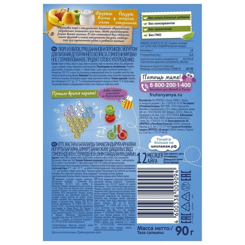 Пюре ФрутоНяня яблоко-груша-банан-персик с йогуртом 90 г Фруктовое пюре в мягкой упаковке “ФрутоНяня” — это вкусный и полезный перекус, который удобно брать с собой, а яркая мягкая упаковка привлечет внимание Вашего малыша и позволит ему есть самостоятельно. А еще можно поиграть с Фрутокрышками! Крышки-конструкторы от упаковок фруктового пюре “ФрутоНяня” выполнены в 7-ми ярких цветах, легко соединяются между собой. Много интересных и веселых поделок можно смастерить из них вместе с мамой! Пюре “ФрутоНяня” в мягкой упаковке. Удобно использовать на прогулке, в путешествии или в гостях. Малыш сможет есть сам без ложечки под присмотром взрослых. Яркая и удобная упаковка привлечет внимание малыша и позволит ему научиться разпознавать цвета, а новые вкусы десертов разнообразят рацион питания малыша. Продукт готов к употреблению. Рекомендации по употреблению: для питания детей с 6 месяцев, начиная с 1 чайной ложки 2 раза в день, постепенно увеличивая к 12 месяцам до 100-150г в день. Не разогревать в микроволновой печи. Не оставляйте детей без присмотра во время использования. Внимание! При транспортировке может произойти нарушение герметичности упаковки. Попробуйте продукт перед кормлением ребенка. Основные характеристики: 100% натурально, без добавления крахмала и сахара, натуральный йогурт, без ГМО, без красителей, без консервантов, без искусственных добавок. Условия хранения: при температуре от 0 °С до +25 °С и относительной влажности воздуха не более 75 %. После вскрытия пакет хранить в холодильнике не более суток. Беречь от солнечных лучей. Срок годности: 12 мес. Состав: пюре из яблок, пюре из груш, пюре из бананов, пюре из персиков, йогурт. Без добавления сахара. Содержит сахара природного происхождения. Страна-производитель Россия Бренд ФрутоНяня