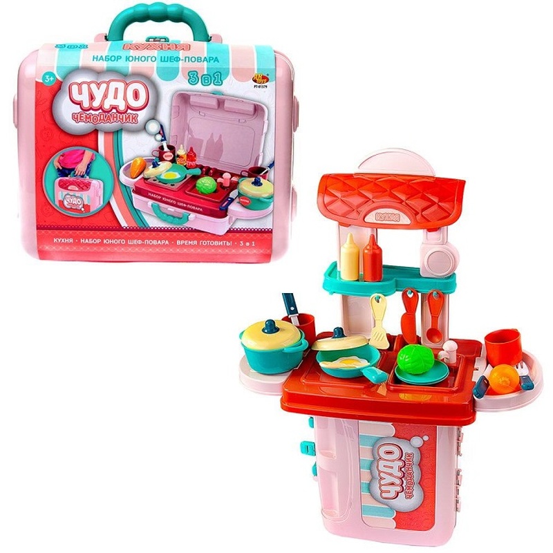 Игровой набор "Кухня маленького шеф-повара" приведет в восторг маленькую хозяйку и мамину помощницу. Яркие, привлекательные цвета, качественный пластик изделия не разочаруют родителей. Такой набор создаст базу для развития у ребенка воображения, социальных и практических навыков. Играя, ребенок получает новуюй информацию об окружающем его мире, учится взаимодействовать и общаться. Набор упакован в компактный чемоданчик, в котором его удобно хранить и транспортировать. С помощью дополнительных элементов набора чемоданчик легко преобразуется в мини-кухню со всем необходимым. Возможны 2 варианта установки кухни в собранном виде. Комлектация набора: чемоданчик - 1 шт, навесные полки - 2 шт, столешница с раковиной и конфоркой - 1 шт, водопроводный кран - 1 шт, полка с крючками -1 шт, стойки 4 шт, колпак вытяжного шкафа - 1 шт, декоративный элемент, 1 шт, кастрюля с крышкой - 1 шт, сковорода с крышкой - 1 шт, чашка - 2 шт, блюдце - 2 шт, столовые приборы - 3 шт, кухонные приборы - 4 шт, бутылочки с продуками - 2 шт, продукты - 3шт.