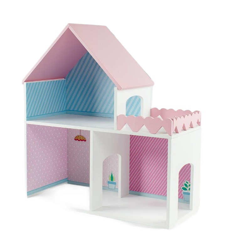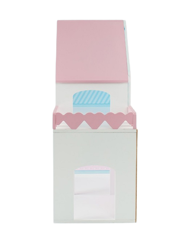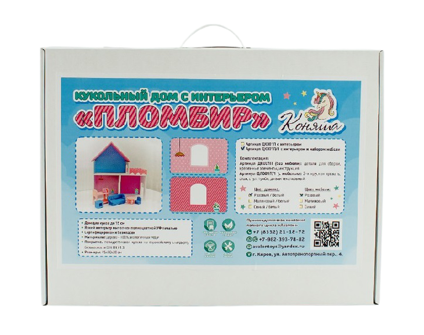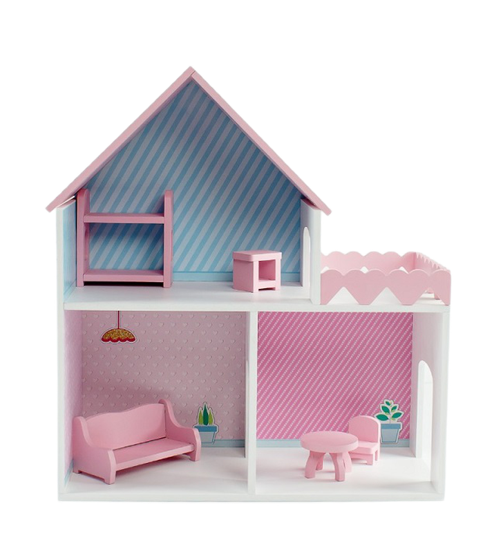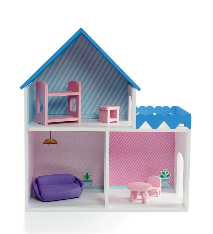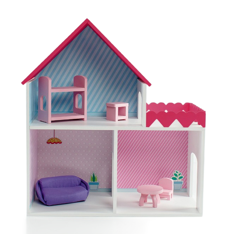 Дом "Пломбир" с интерьером Особенности: Деревянный дом для кукол до 15 см. С цветным интерьером (полноцветная УФ печать). 2 этажа, 3 комнаты, терраса. Основной цвет белый. Цветные элементы: крыша и забор террасы. (Возможность выбора палитры:синий, малиновый, розовый) Размеры: 45x50x20 см