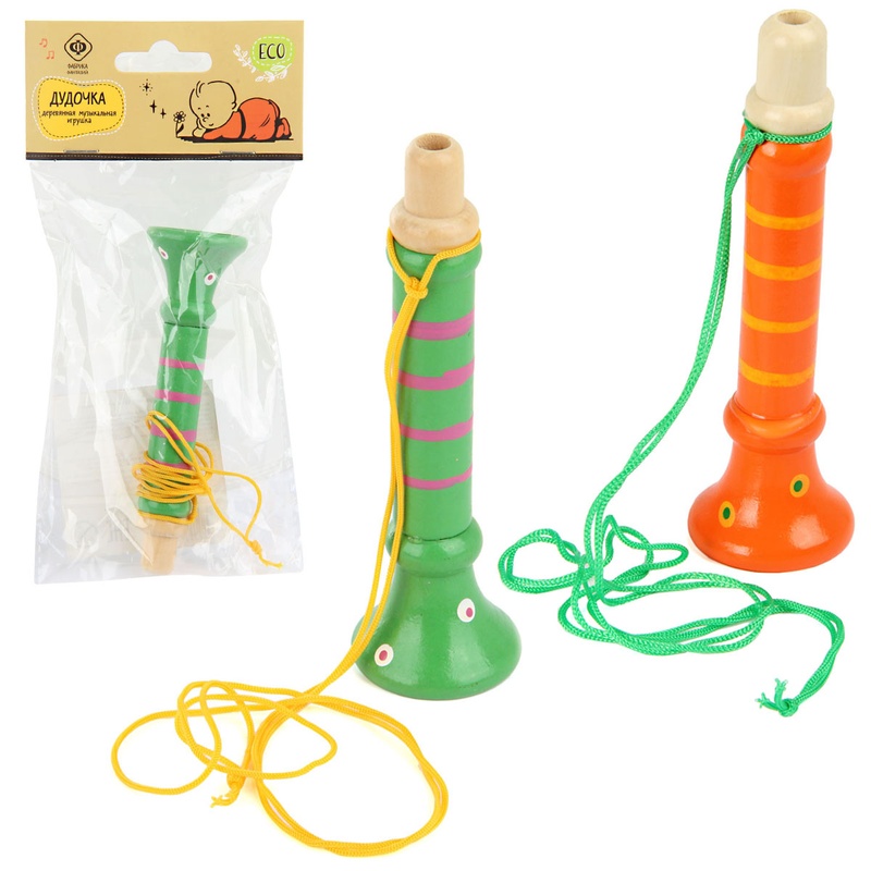 Дудочка - легкий и удобный в обращении музыкальный инструмент, выполненный в яркой расцветке, не оставит равнодушным ни одного малыша. Играть на дудочке следует, как на обычном инструменте, дудочка будет издавать соответствующий звук. Игрушка развивает слух, музыкальное восприятие, координацию движений и мелкую моторику рук. Хорошо тренирует дыхательную систему, память и концентрацию внимания. Игрушка изготовлена из экологически чистого и долговечного материала - дерева, есть текстильный элемент. Деревянные детали гладко отшлифованы, не имеют острых углов, сколов и зазубрин. Игрушка представлена в ассортименте. Игрушка упакована в пакет с картонным хедером с отверстием. Размеры игрушки без учета шнурка: 12,5*4*4 см. Размеры игрушки в упаковке: 7,5*4*19 см.