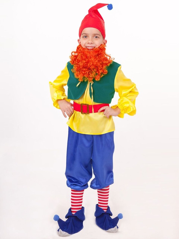 Особенности: Рубаха желтого цвета с вшитой зеленой жилеткой С длинными рукавами на резинке Рубашка подвязывается красным поясом, который застегивается на липучку сзади Брючки просторного кроя + красно-белые гетры Синие бархатные башмачки с помпонами на загнутых концах Помпон на колпаке Борода рыжевого цвета кудрявая на резинке Характеристики: Ткань: полиэстер Рост: 110-146 см Размеры: 28-38 Производитель: Пуговка, Россия