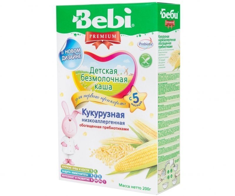 Bebi Безмолочная Кукурузная низкоаллергенная каша с пребиотиками с 5 мес. 200 г Бренд: Bebi (Словения), Возраст: с 5 мес Кукурузная низкоаллергенная каша - это сухая быстрорастворимая кашка на основе кукурузной крупы. Сочетает максимальную пользу крупы и пребиотического компонента. Отсутствие в составе каши молока, сахара, глютена позволяет использовать ее в качестве первого прикорма, уже с 5 месяцев. Кукурузная каша с пребиотиками способна нормализовать работу желудочно-кишечного тракта и станет полезным дополнением в меню ребенка с аллергическими реакциями, непереносимостью лактозы. Состав: кукурузная крупа 92,9%, инулин 7%, витамины: (ретинола ацетат, холекальциферол, токоферола ацетат, тиамина гидрохлорид, рибофлавин, пиридоксина гидрохлорид, аскорбиновая кислота, кальция пантотенат, фолиевая кислота, никотинамид, фитоменадион, цианокобаламин) и минеральные вещества: (дифосфат железа, иодид калия). Особенности: Не содержит вкусовых добавок, ароматизаторов, консервантов, красителей, генетически модифицированных продуктов Диетическая, низкоаллергенная, не содержит молока, глютена, без добавления сахара Не требует варки Обогащена пребиотиками, 12 витаминами, железом и йодом Энергетическая ценность 100 мл готового продукта: 44 ккал Пищевая ценность 100 мл готового продукта: белки - 0,9 г, углеводы - 8,8 г (из них сахар - 0,2 г), жиры - 0,2 г, пищевые волокна - 1,2 г