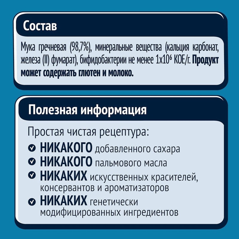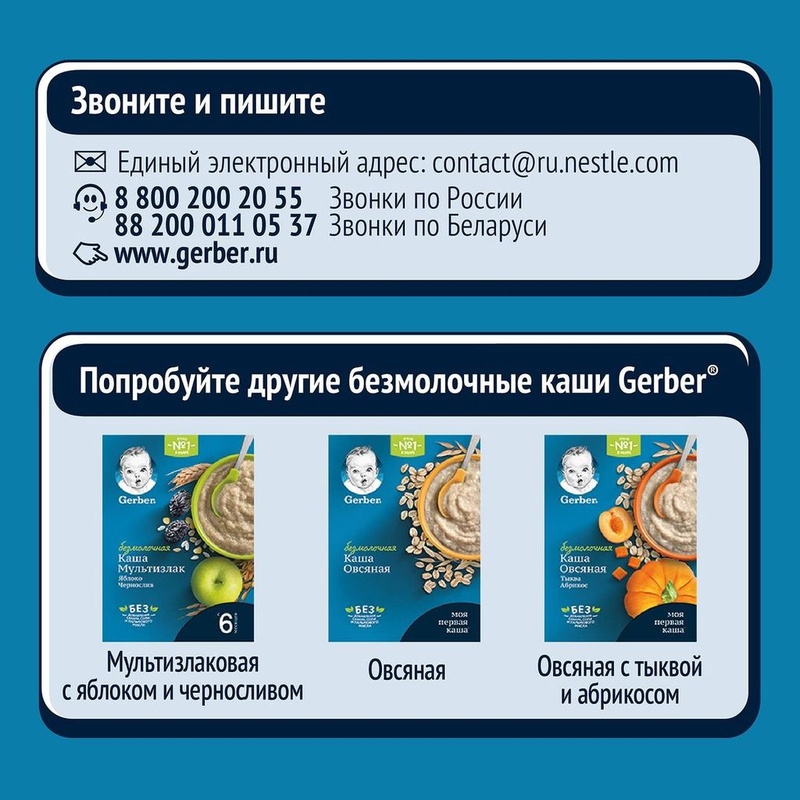 Каша безмолочная Gerber гречка 180г с 4месяцев Gerber знает, что введение прикорма – особенное событие для вас и вашего малыша. Вы хотите, чтобы ваш малыш пробовал только лучшее. И мы тоже! Именно поэтому каши Gerber содержат только натуральные ингредиенты и ничего лишнего. Мы выстраиваем долгосрочные партнерские отношения с фермерами и поставщиками сырья, чтобы обеспечить максимально высокое качество фруктов и злаков. Мы добавляем в каши Gerber железо, так как этот элемент необходим для профилактики железодефицита и для полноценного физического и умственного развития. Каши Gerber имеют простую чистую рецептуру: никакого добавленного сахара никакого пальмового масла никаких искусственных красителей, ароматизаторов, и консервантов никаких генетически модифицированных ингредиентов Состав: мука гречневая (98,7%), минеральные вещества (кальция карбонат, железа(II) фумарат), бифидобактерии не менее 1х106 КОЕ/г. Продукт может содержать глютен и молоко. Продукт упакован в модифицированной атмосфере с азотом. Условия хранения: закрытую пачку следует хранить в сухом месте при температуре не более 25?С и относительной влажности не более 75%. Вскрытый пакет следует плотно закрыть. Открытую пачку с продуктом следует хранить в сухом прохладном месте не более двух недель. Срок годности: 15 месяцев. Дата изготовления и упаковывания, срок годности и, номер партии указаны на нижней панели упаковки. Всемирная организация здравоохранения (ВОЗ) рекомендует исключительно грудное вскармливание в первые 6 месяцев жизни. Проконсультируйтесь со специалистом, когда вводить прикорм ребенку. После введения прикорма грудное вскармливание следует продолжать как можно дольше. Компания Nestle поддерживает данную рекомендацию. Страна-производитель Россия Бренд Gerber