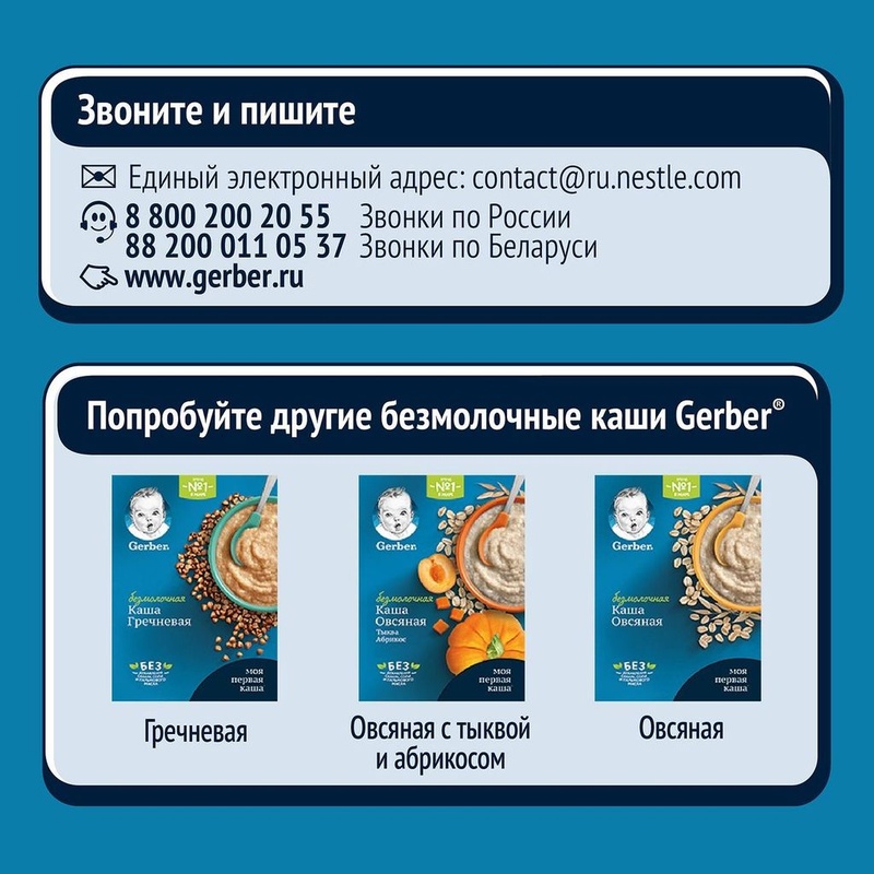 Каша безмолочная Gerber мультизлаковая чернослив-яблоко 180г с 6 месяцев Gerber знает, что введение прикорма – особенное событие для вас и вашего малыша. Вы хотите, чтобы ваш малыш пробовал только лучшее. И мы тоже! Именно поэтому каши Gerber содержат только натуральные ингредиенты и ничего лишнего. Мы выстраиваем долгосрочные партнерские отношения с фермерами и поставщиками сырья, чтобы обеспечить максимально высокое качество фруктов и злаков. Мы добавляем в каши Gerber железо, так как этот элемент необходим для профилактики железодефицита и для полноценного физического и умственного развития. Каши Gerber имеют простую чистую рецептуру: никакого добавленного сахара никакого пальмового масла никаких искусственных красителей, ароматизаторов, и консервантов никаких генетически модифицированных ингредиентов Состав: мука (пшеничная (80,7%) (содержит глютен), гречневая (4,2%), рисовая (4,2%), кукурузная (2,8%), овсяная (2,8%) (содержит глютен)), хлопья яблока (2%), хлопья чернослива (2%), минеральные вещества (кальция карбонат, железа(II) фумарат), бифидобактерии не менее 1х106 КОЕ/г. Продукт может содержать молоко. Продукт упакован в модифицированной атмосфере с азотом. Условия хранения: закрытую пачку следует хранить в сухом месте при температуре не более 25?С и относительной влажности не более 75%. Вскрытый пакет следует плотно закрыть. Открытую пачку с продуктом следует хранить в сухом прохладном месте не более двух недель. Срок годности: 15 месяцев. Дата изготовления и упаковывания, срок годности и, номер партии указаны на нижней панели упаковки. Всемирная организация здравоохранения (ВОЗ) рекомендует исключительно грудное вскармливание в первые 6 месяцев жизни. Проконсультируйтесь со специалистом, когда вводить прикорм ребенку. После введения прикорма грудное вскармливание следует продолжать как можно дольше. Компания Nestle поддерживает данную рекомендацию. Страна-производитель Россия Бренд Gerber