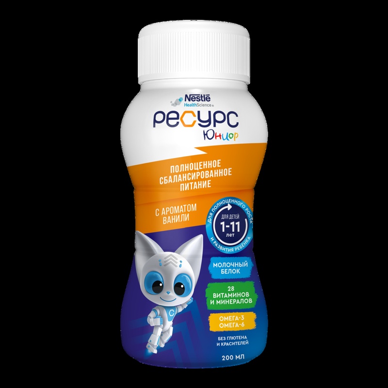 Resource Clinutren Junior (Ресурс Клинутрен Юниор) — полноценное сбалансированное питание для детей с 1 года до 11 лет в готовой к употреблению форме. Применяется для поддержки ребенка во время активного роста, интенсивных физических и умственных нагрузок, для поддержки сил во время заболеваний и в период выздоровления. Легко усваивается и обеспечивает полноценным составом питательных веществ. Универсальный продукт для медицинского и повседневного применения в удобном формате бутылочки 200 мл. 1 бутылочка заменяет полноценный прием пищи и содержит: 6г цельного молочного белка: белок молочной сыворотки быстро усваивается и помогает восстановить силы, а казеин обеспечивает чувство сытости Омега-3 и Омега-6 способствуют укреплению иммунитета, улучшению памяти и внимания детей 29 витаминов и минералов, необходимых для развития ребенка Питание Resource Clinutren Junior: помогает полноценно накормить ребенка во время болезни, даже при высокой температуре, когда он ничего не может есть и слабеет на глазах способствует укреплению иммунитета и ускоряет восстановление после болезни дает силы, для того, чтобы справиться с усталостью и нагрузками восполнит недостаток микро- и макроэлементов Не содержит сою, ГМО, глютен, лактозу. Состав: вода, мальтодекстрин, растительныемасла (подсолнечное, высокоолеиновое, рапсовое), сахароза, молочныйбелок (казеин 80%, белокмолочной сыворотки 20%), минеральныевещества (калияцитрат, натрияцитрат, кальцияцитрат, натрияфосфат, калияхлорид, магнияцитрат, магнияоксид, железасульфат, цинкасульфат, магниясульфат, медисульфат, натрияфторид, хромахлорид, калияйодид, натриямолибдат, натрияселенат), кукурузный крахмал, эмульгатор (Е471), ароматизаторнатуральный (клубника), витамины (L-аскорбатнатрия, DL-альфа-токоферолаацетат (E), никотинамид (PP), D-пантотенаткальция (B5), пиридоксингидрохлорид (В6), тиаминамононитрат (B1), рибофлавин-5-фосфатнатрия (B2), ретинолаацетат (А), фолиеваякислота, филлохинон (К), D-биотин (биотин), D3 холекальциферол (D), цианкобаламин (В12), загуститель (каррагинан). Страна-производитель Франция Бренд: Nestle