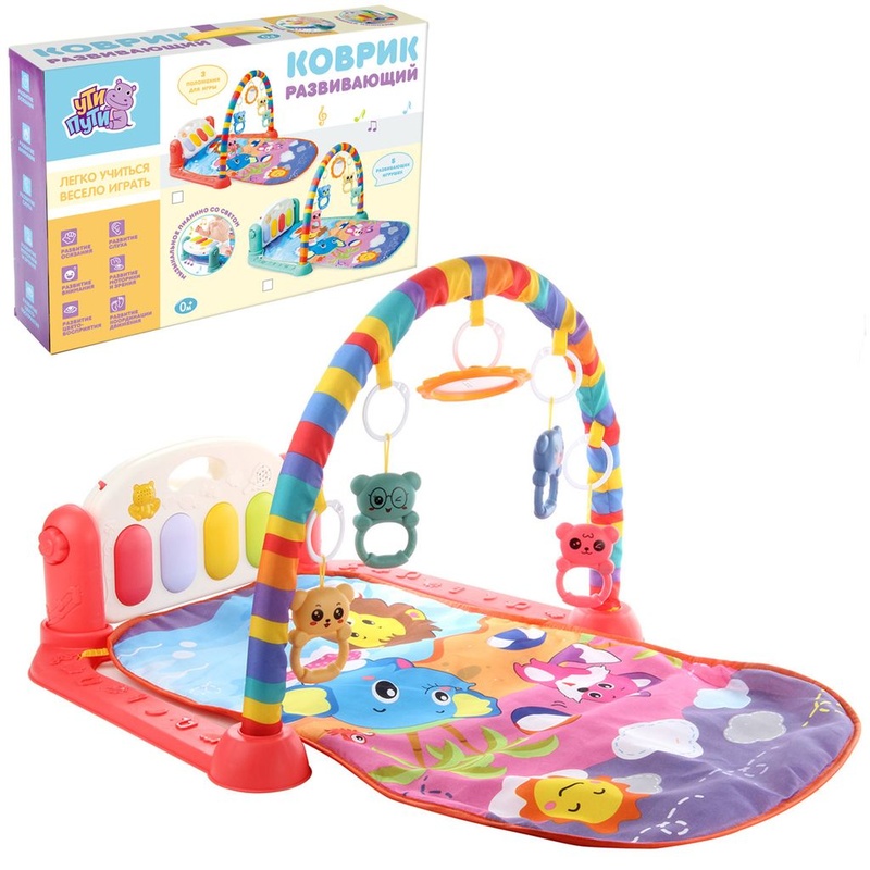 Невероятно полезный для развития малыша яркий и красивый игровой коврик подарит ребенку немало увлекательных часов игры и массу позитивных эмоций. С этим развивающим ковриком малыш будет учиться переворачиваться, сидеть, станет с интересом исследовать окружающий мир. В комплект входят детали для сборки игрового коврика и фигурки-подвески. У коврика мягкая подкладка. Конструкция с ковриком легко собирается и разбирается, занимает мало места в сложенном виде. Возможны 3 положения пианино: - горизонтальное (ребенок сидит и играет ручками); - вертикальное (ребенок играет, нажимая ножками на клавиши. Клавиши большие, удобно нажимать); - под наклоном. Фигурки-подвески снимаются, есть имитация зеркала. Фигурки шумят, если их потрясти, выполнены в яркой и красивой расцветке, удобные ручки, комфортно держать. Пианино работает от батареек. У пианино несколько режимов работы, которые можно переключать с помощью кнопки в виде пчелки: - режим звуков. Нажимаем на клавишу, она издает звук детского смеха, клавиша подсвечивается; - режим ритм-секции. При нажатии на клавишу издает звуки ударных, кнопки подсвечиваются; - режим ноты. Нажимаем на клавишу, она издает звук ноты и подсвечивается; - режим мелодий. При нажатии на клавиши пианино проигрывает мелодии, кнопки подсвечиваются. Повторное нажатие на клавишу - проигрывание следующей мелодии; - режим звуков зверюшек, при нажатии на клавиши воспроизводит звуки, которые издают зверюшки (собачка, обезьянка, коровка, козочка). Клавиша подсвечивается; - при нажатии на кнопку в виде пчелки пианино издает разнообразные звуки, проигрывает мелодии, кнопки подсвечиваются. Благодаря такому коврику ребенок будет с удовольствием развивать зрительное и слуховое восприятие, мелкую и крупную моторику, координацию движений, хватательный рефлекс, станет тренировать концентрацию внимания, познакомится с цветами и формами. Набор станет хорошим подарком, который обязательно оценит каждый малыш. Набор предназначен для детей до 3 лет. Пианино работает от 3 батареек АА, не входят в комплект. Набор изготовлен из высококачественных и безопасных полимерных и текстильных материалов. Размеры коврика в собранном виде: 76*56*43 см. Размеры фигурки-подвески: 6,5*2,5*9 см. Размеры коробки: 45*9*30 см.