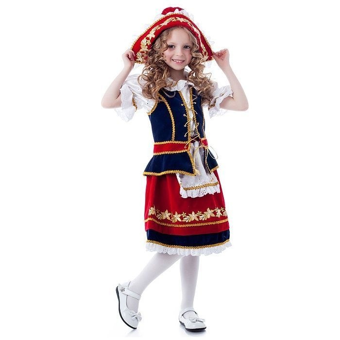 Карнавальный костюм Красная шапочка Арт. 945 Очаровательный и очень красивый костюм Красная Шапочка способен удивить и порадовать всех маленьких любительниц сказок. Выполненный из бархата в красных и синих тонах, этот наряд богато украшен золотыми узорами, тесьмой и оборками. В нем любая девочка сможет почувствовать себя настоящей сказочной героиней. Особенности: Белая блузка с оборками на рукавах и воротнике Короткие рукава-фонарики Синий жилет с имитацией красного пояса, золотой тесьмой и шнуровкой Юбка с оборкой и золотым узором на подоле Вшитый белый фартук Красный капор с узорами и оборкой по краю Характеристики: Материал: бархат Размер: 30 - 36 Рост: 116 - 146 см Производитель: Батик Страна-изготовитель Россия.