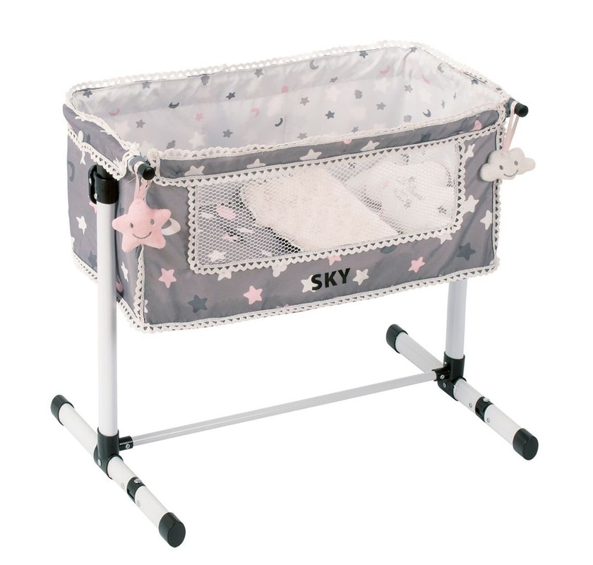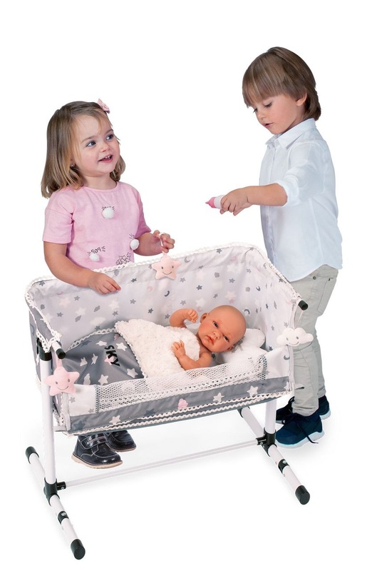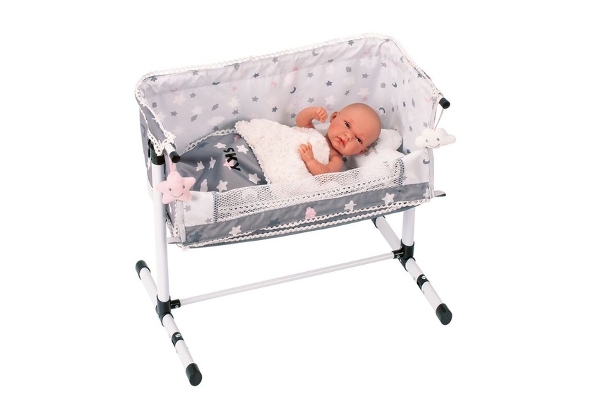 Кроватка для куклы серии Скай, с опускающимся бортиком, 50 см, DeCuevas, 51224 Кукольная кроватка оформлена в дизайне коллекции «Скай» серая ткань с рисунком из звезд прекрасно гармонирует с сетчатой вставкой и нежным белым кружевом. Кроватку украшают мягкие игрушки, и даже подушка выполнена в этом стиле - в форме облака. Любимая кукла теперь будет сладко засыпать в ней под тихие колыбельные песенки. Особенности: - Кроватка позволит девочке расширить границы сюжетно-ролевой игры со своей любимой куклой. - Игрушка исполнена в реалистичной манере, отличается от настоящей кроватки для ребенка лишь размером. - Уникальный дизайн игрушки исполнен в нейтральном сером цвете, кроватка украшена рисунком из звезд, нежным белым кружевом и мягкими игрушками в виде звезд и облаков. - У изделия прочный металлический каркас, окрашенный белой краской с устойчивым основанием. - Куколке будет просторно и комфортно в люльке с одеялком и фигурной подушкой, стилизованной под облако. - Боковой бортик имеет сетчатое окошко, благодаря которому можно будет наблюдать, как сладко спит куколка. - Бортик кроватки можно упускать, чтобы было удобно укладывать куколку. - Благодаря кроватке сюжетно-ролевая игра подарит ребенку новые эмоции, поможет развить воображение и фантазию. Характеристики: Комплект: кроватка, подушечка, одеяло. Возраст: от 3 лет. Состав: текстиль, металл, пластик. Размер кровати в собранном виде: 50 x 34 x 43/48/50 см. Вес: 3.9 г. Размер упаковки: 52 х 27 х 8 см. Упаковка: картонная коробка. Производитель: DeCuevas. Страна обладатель бренда: Испания.