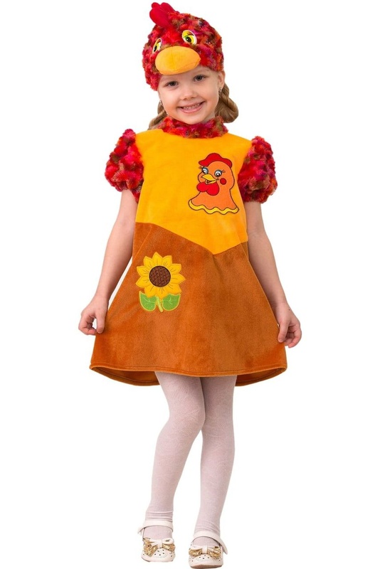 Карнавальный костюм Курочка Ряба Арт. 327 Карнавальный костюм Курочка Ряба для девочки подарит возможность оказаться в знаменитой русской народной сказке. Наряд идеален для спектакля или выступления. Смотрится ярко и оригинально. Красочное сочетание цветов дополнено качественным мягким плюшем, из которого пошит карнавальный костюм Курочка Ряба. Комплект состоит из платья и шапки. Особенности: Рукава и воротник оторочены яркой меховой тканью Нашивки в виде подсолнуха и курицы Платье двухцветное А-силуэта Шапка пестрая с пришитым гребешком, глазами и клювом курицы Характеристики: Материал: плюш Размеры: 28 Рост: 110 см Производитель: Батик Страна-изготовитель Россия.