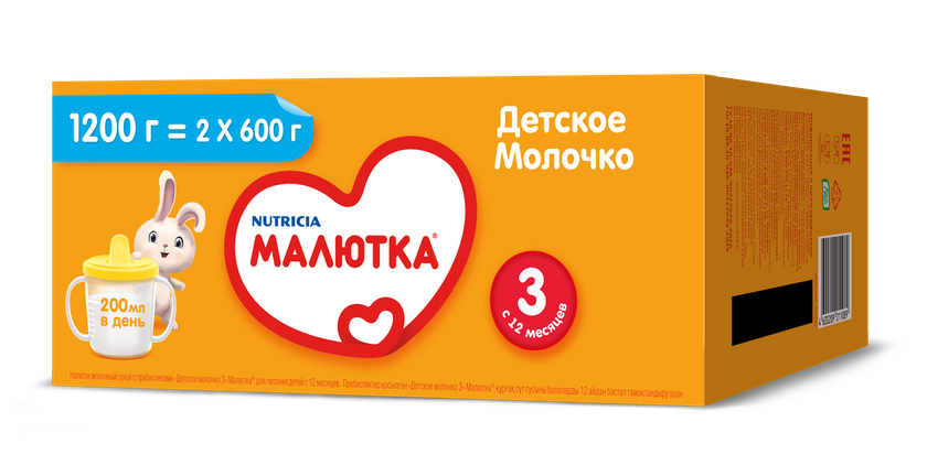 Малютка 3 1,2 кг Малютка 3 – это комплексная полноценная и нежная забота о малыше от 1 года, который стал старше и активнее. Несмотря на это, он все еще нуждается в особом дополнительном питании, которое станет заменой коровьему молоку, использование которого может привести к неблагоприятным последствиям. Смесь обязательно понравится малышу и обеспечитего всем необходимым для здоровья и роста. Смесь улучшит пищеварение и обеспечит Вашему малышу сбалансированное питание и комплексную заботу, поскольку в ее состав входят пищевые волокна, питательные вещества, минералы и витамины, специально подобранные для растущего детского организма. Нуклеотиды, входящие в состав смеси, способствуют созреванию иммунной системы и развитию мозга. Также смесь обогащена железом для профилактики развития анемии, йодом для нормального роста и интеллектуального развития, селеном для укрепления иммунитета. Малютка 3 отвечает как современным российским, так и международным стандартам качества, и разработана с учетом потребностей российских детей в возрасте от 1 до 3 лет. Сбалансированный состав смеси обеспечивает полноценное развитие ребенка. Продукт одобрен Союзом педиатров России. Состав: мальтодекстрин, молоко сухое обезжиренное, смесь масел (рапсовое, пальмовое, кокосовое, подсолнечное), комплексная пищевая добавка (витамин С, витамин Е, соевый лецитин), инулин, минеральные вещества, комплекс витаминов, холин, нуклеотиды, L-карнитин. Особенности: Приятный вкус и нежная онсистенция Содержит 17 витаминов, 12 минералов (в том числе: кальций, йод, железо, селен) Не содержит сахараНеобходима консультация специалистов.Молочная смесь предназначена для питания детей с 12 месяцев.