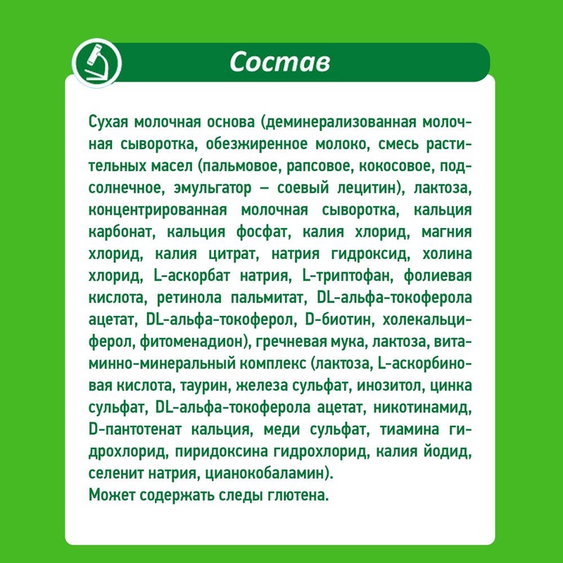 Малыш с гречневой мукой — молочная сухая последующая частично адаптированная смесь. Содержит все необходимые витамины, минералы и полезные вещества, которые непосредственно влияют на развитие малыша. Состав обогащен гречневой мукой, благодаря которой смесь обладает выраженным питательным и насыщающим эффектом. Именно поэтому она хорошо утоляет голод и подходит для малышей, которые стали хуже выдерживать промежутки между кормлениями. Гречневая мука питательна и богата полезными микроэлементами и особенно железом. Витамины группы В, минералы и ценные аминокислоты, которые содержит гречка, необходимы малышу для полноценного роста и развития. Состав: молоко сухое обезжиренное, смесь растительных масел (рапсовое, пальмовое, кокосовое, подсолнечное, соевый лецитин, комплексная пищевая добавка (витамин С, витамин Е, соевый лецитин), сахарная пудра, мука гречневая, мальтодекстрин, минеральные вещества, витамины, холин, L-карнитин. Особенности: Приятный вкус и нежная онсистенция Может использоваться в качестве как основного продукта, так и дополнения к обычной молочной смеси Содержит комплекс витаминов, кальций, йод, железо, селен Сбалансированный состав Без консервантов Энергетическая ценность на 100 г: 497,5 ккал Пищевая ценность на 100 г: белок - 14,3 г, жиры - 25,5 г, углеводы - 52,7 гНеобходима консультация специалистов. Молочная смесь предназначена для питания детей с 6 месяцев. Создано программой AVS Document Converter www.avs4you.com