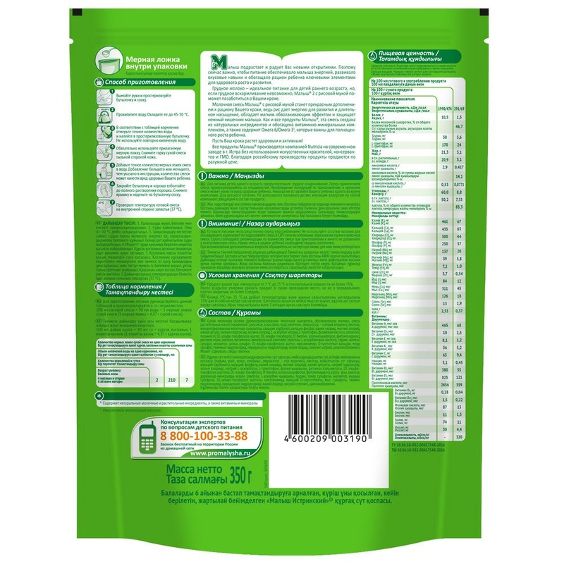 Малыш с рисовой мукой — молочная сухая последующая частично адаптированная смесь. Содержит все необходимые витамины, минералы и полезные вещества, которые непосредственно влияют на развитие малыша. Состав обогащен рисовой мукой, благодаря которой смесь обладает выраженным питательным и насыщающим эффектом. Именно поэтому она хорошо утоляет голод и подходит для малышей, которые стали хуже выдерживать промежутки между кормлениями. Рисовая мука содержит мало клетчатки, поэтому полезна детям со склонностью к неустойчивому стулу. Но она мало подходит детям, предрасположенным к запорам, так как может его спровоцировать. Рис обладает обволакивающим эффектом, что является защитным механизмом при кишечных расстройствах. Состав: молоко сухое обезжиренное, смесь растительных масел (рапсовое, пальмовое, кокосовое, подсолнечное, соевый лецитин, комплексная пищевая добавка (витамин С, витамин Е, соевый лецитин), сахарная пудра, мука рисовая, мальтодекстрин, минеральные вещества, витамины, холин, L-карнитин. Особенности: Может использоваться в качестве как основного продукта, так и дополнения к обычной молочной смеси Содержит комплекс витаминов, кальций, йод, железо, селен Сбалансированный состав Без консервантов Энергетическая ценность на 100 г: 496,3 ккал Пищевая ценность на 100 г: белок - 14,0 г, жиры - 25,5 г, углеводы - 52,7 гНеобходима консультация специалистов. Молочная смесь предназначена для питания детей с 6 месяцев. Создано программой AVS Document Converter www.avs4you.com