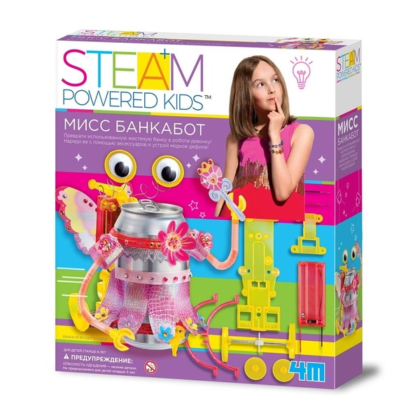 Превратите использованную жестяную банку в робота-девочку, нарядите ее с помощью аксессуаров и устройте модное дефиле! Не нужно быть волшебником, чтобы оживлять предметы, просто соберите набор «Мисс Банкабот». В комплекте: - 4 кольца для тела - Корпус - 4 болта и гайки - Винты - Короткая нога - 2 соломинки - 2 клеммные крышки - 2 рука-манипуляторы - Игрушечный мотор с редуктором - 2 глазные пластины - Металлическая проволока - 2 движущихся глаза - Ось с редуктором - Крышка двигателя/оси - Лоскут розовой ткани - Наклейки в виде камней - Двусторонняя клейкая лента - Кружево - Лента - Лист с наклейками Также потребуются (не входят в набор): маленькая крестовая отвертка, батарейка типа АА, чистая пустая жестяная банка. Как это работает? Батарейка подает мотору электричество, мотор с большой скоростью крутит червячную передачу. Она выполняет роль редуктора: поворачивает шестерню с более низкой скоростью. Шайбы на концах оси — это просто круги с выступами. Когда шайба вращается, выступ крутится. Когда мотор работает, шайбы заставляют стороны робота подниматься по очереди, и он шагает. Меры предосторожности. Набор предназначен для детей старше 8 лет. Перед началом сборки внимательно прочтите инструкцию. Помните, что при работе с конструктором требуется контроль взрослых. Игрушка предусматривает наличие мелких деталей, поэтому не рекомендуется детям младше 3 лет. Используйте под наблюдением взрослых. Чтобы избежать короткого замыкания, не касайтесь контактов в батарейном отсеке металлическими предметами.