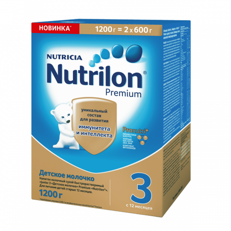 Детское молочко Nutrilon 3 Premium с 12 мес. 1200 г. Уникальный состав Nutrilon 3 Premium с комплексом Pronutri+ способствует развитию иммунитета и интеллекта, помогая Вашему малышу развиваться. Пребиотики Gos/Fos помогают развитию собственной здоровой микрофлоры кишечника, а также поддерживают иммунитет малыша, помогая снижать риск возникновения аллергии и инфекций. Nutrilon 3 Premium с комплексом Pronutri+ – уникальное детское молочко в России с клинически доказанным положительным влиянием на иммунную систему малыша. Особые жирные кислоты помогают правильному развитию мозга и зрения крохи, положительно влияют на иммунитет. Только Nutrilon Premium содержит самый полный комплекс особых жирных кислот ARA/DHA/EPA в достаточном количестве. Сбалансированный витаминный комплекс, разработанный специально с учетом потребностей детей старше года, а также достаточное количество железа и йода способствуют здоровому и гармоничному росту ребенка. Оптимальное содержание кальция и витамина D поможет укрепить зубы и кости малыша. Особенности: Комплекс Pronutri+. Пребиотики Gos/Fos. Жирные кислоты EPA/DHA. Комплекс витаминов. Полный состав продукта: обезжиренное молоко, смесь растительных масел (пальмовое, подсолнечное, рапсовое), лактоза, пребиотики (галактоолигосахара, фруктоолигосахара), деминерализованная молочная сыворотка, концентрат белков молочной сыворотки, минеральные вещества, рыбий жир, витаминный комплекс, соевый лецитин, холин, таурин, микроэлементы. Торговая марка Nutrilon