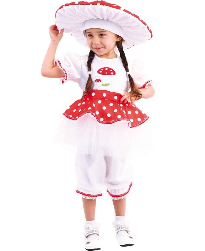Особенности: Белое короткое платье в горошек с пышным прозрачным подолом Нашивка в виде мухоморов на груди Рукава-фонарики короткие Застегивается на молнию сзади Легкие белые панталоны Шляпка мухомора большая Характеристики: Материал: полиэстер Рост: 110 - 134 Производитель: Пуговка, Россия