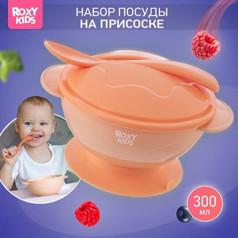 Набор для кормления: тарелка на присоске, крышка и ложка, персиковый