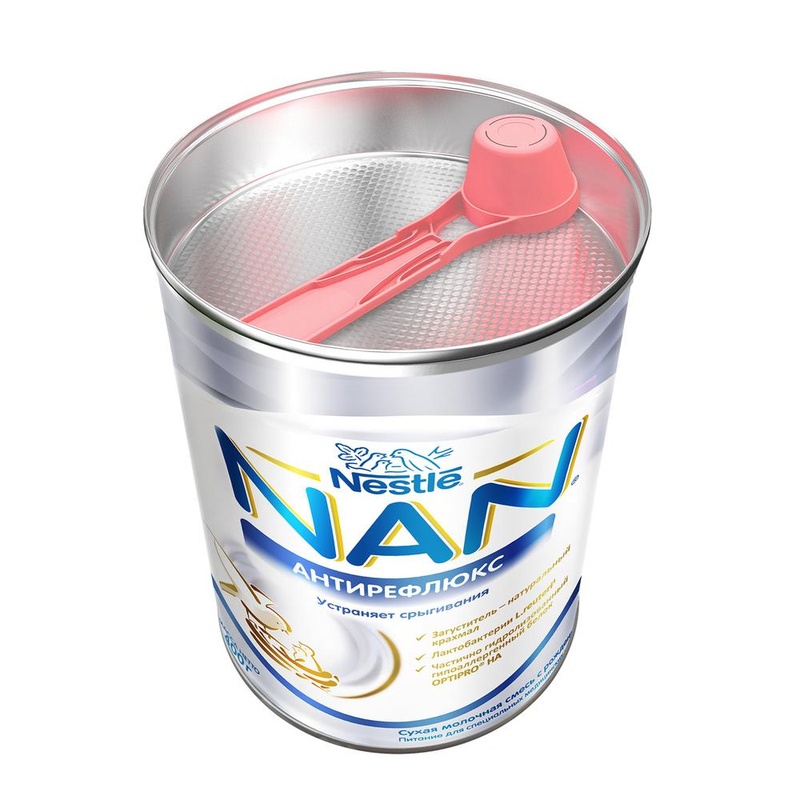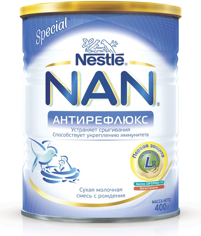 Сухая молочная смесь Nestle NAN «Анти-рефлюкс» помогает снизить риск возникновения срыгиваний, сглаживает и снимает проблемы с пищеварением. · После назначения этой смеси даже частые и обильные срыгивания перестанут беспокоить малыша и его родителей. · Введенная в состав смеси культура живых бифидобактерий BL бережно заботится о пищеварении ребенка, защищает и нормализует его, а также способствует формированию здорового иммунитета. · Пребиотики Prebio (ГОС/ФОС = 90/10) обеспечивают нормальный состав микрофлоры кишечника ребенка. Гиппоалергенный белок OPTIPRO, который благодаря умеренному гидролизу предупреждает развитие аллергии и обеспечивает нормальный рост и развитие. Уникальную комбинацию компонентов «Первая защита», которые обладают защитным действием, предупреждают риск развития аллергии, способствуют становлению и укреплению иммунитета ребенка в первые месяцы жизни. Крахмал для устранения срыгиваний. Бифидобактерии BL - живые бифидобактерии, подобные тем, что находятся в кишечнике ребенка на грудном вскармливании, они поддерживают здоровую микрофлору и способствуют укреплению иммунитета. Состав: Лактоза, картофельный крахмал, частично гидролизованный сывороточный белок, растительные масла, кальция хлорид, L-аргинин, хлорид магния, L-гистидин, холин, L-тирозин, витамины, таурин, инозитол, нуклеотиды, сульфат железа, L-карнитин, сульфат цинка, культура бифидобактерий, сульфат меди, сульфат марганца, йодид калия, биотин. Грудное молоко – лучшее питание для ребенка, его необходимо сохранять как можно дольше. Оно обеспечивает организм малыша необходимыми витаминами, минералами и макроэлементами для полноценного развития интеллекта малыша и крепкого иммунитета. Но если по каким-то причинам грудное вскармливание в полном объеме невозможно, педиатр поможет Вам подобрать детскую молочную смесь, по составу и свойствам приближенную к грудному молоку. Технические характеристики: Прочие характеристики Бренд NAN Возраст с рождения Форма смеси Сухая Тип упаковки Жестяная банка Состав смеси на коровьем молоке Количество в коробке 12