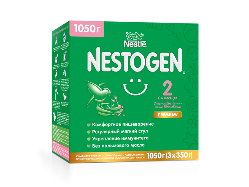 Cмесь Nestogen 2 была специально разработана для обеспечения сбалансированного здорового питания и комфортного пищеварения малыша. Смесь Nestogen 2 с пребиотиками и уникальными лактобактериями L.reuteri способствует улучшению моторики кишечника, формированию регулярного мягкого стула и становлению здоровой микрофлоры. Здоровая кишечная микрофлора необходима для поддержания, развития и укрепления иммунитета. Лютеин и омега-3 ПНЖК способствуют развитию мозга. Смесь содержит сбалансированный комплекс витаминов и минеральных веществ для гармоничного роста и развития. Смесь Nestogen 2 молочная смесь, предназначенная для вскармливания детей с 6 месяцев в качестве молочной составляющей рациона ребенка наряду с продуктами прикорма. Она содержит сбалансированный комплекс витаминов и минеральных веществ для гармоничного роста и развития. Переход на новую смесь должен осуществляться постепенно! ВАЖНОЕ ПРИМЕЧАНИЕ Идеальной пищей для грудного ребенка является молоко матери. Перед тем как принять решение об искусственном вскармливании с использованием детской смеси, обратитесь за советом к медицинскому работнику. Возрастные ограничения указаны на упаковке товаров в соответствии с законодательством РФ. Смесь Nestogen 2 предназначена для кормления здоровых детей с 6 месяцев и является молочной составляющей рациона ребенка в случаях, когда грудное вскармливание невозможно. Смесь Nestogen 2 не может быть использована в качестве заменителя грудного молока в первые 6 месяцев жизни ребенка. Продукт изготовлен из сырья, произведенного специально одобренными поставщиками, без использования генетически модифицированных ингредиентов, консервантов и красителей. Состав смеси в новом дизайне упаковки: Обезжиренное молоко, сыворотка молочная деминерализованная, мальтодекстрин, смесь растительных масел (низкоэруковое рапсовое, подсолнечное, подсолнечное высокоолеиновое, кокосовое), молочный жир, пребиотики (галактоолигосахариды (ГОС) и фруктоолигосахариды (ФОС)), цитрат кальция, эмульгатор ( соевый лецитин), цитрат натрия, хлорид калия, фосфат калия, фосфат калия, витаминный комплекс (L-аскорбат натрия(С), DL-альфа-токоферолла ацетат (Е), пантотеновая кислота (D-пантотенат кальция), никотинамид (PP), тиамина мононитрат (B1), ретинола ацетат (A), пиридоксин гидрохлорид (B6), рибофлавин(B2), фолиевая кислота (В9),фитоменадион (K), D-биотин, Д3 холекальциферол (Д), цианкобаламин (В12)), рыбий жир, культура лактобактерий L.reuteri (не менее 1,0 х 10^6 КОЕ/г), цитрат магния, цитрат калия, таурин, сульфат железа, сульфат цинка, нуклеотиды, сульфат меди, йодид калия, лютеин, селенат натрия. Состав смеси в старом дизайне упаковки: Обезжиренное молоко, мальтодекстрин, сыворотка молочная деминерализованная, смесь растительных масел (низкоэруковое рапсовое, подсолнечное, подсолнечное высокоолеиновое, кокосовое), молочный жир, пребиотики (галактоолигосахариды (ГОС) и фруктоолигосахариды (ФОС)), эмульгатор ( соевый лецитин), цитрат кальция, цитрат натрия, фосфат кальция, хлорид калия, фосфат калия, витамины (L-аскорбат натрия, аскорбилпальмитат (С), DL-альфа-токоферолла ацетат (Е), D-пантотенат кальция (B5), никотинамид (PP), тиамина мононитрат (B1), ретинола ацетат (A), пиридоксин гидрохлорид (B6), рибофлавин(B2), D3 холекальциферол (Д), фитоменадион (К), фолиевая кислота (В9), D-биотин (B7), цианкобаламин (В12)), цитрат м