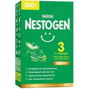 Детское молочко Nestogen 3 было специально разработано для обеспечения сбалансированного здорового питания и комфортного пищеварения малыша. Молочко Nestogen 3 с пребиотиками и уникальными лактобактериями L.reuteri способствует улучшению моторики кишечника, формированию регулярного мягкого стула и становлению здоровой микрофлоры. Здоровая кишечная микрофлора необходима для поддержания, развития и укрепления иммунитета. Молочко Nestogen 3 сбалансированный продукт, заменяющий коровье молоко в рационе ребенка старше года. Детское молочко Nestogen 3 дополняет рацион ребенка питательными веществами, необходимыми для его оптимального роста и развития. Состав: Обезжиренное молоко, мальтодекстрин,сыворотка молочная деминералированная, смесь растительных масел (низкоэруковое рапсовое, подсолнечное, подсолнечное высокоолеиновое, кокосовое), молочный жир, лактоза, пребиотики (галактоолигосахариды (ГОС) и фруктоолигосахариды (ФОС)), цитрат кальция, эмульгатор (соевый лецитин), цитрат калия, фосфат кальция, цитрат натрия, витамины (L-аскорбат натрия, аскорбилпальмитат ©, DL-альфа-токоферола ацетат (Е), D-пантотенат кальция (B5), никотинамид (PP), тиамина мононитрат (B1), ретинола ацетат (A), пиридоксин гидрохлорид (B6), рибофлавин(B2), D3 холекальциферол (Д), фитомаменадион (К), фолиевая кислота (В9), D-биотин (B7), , цианкобаламин (В12)),фосфат натрия, фосфат калия, цитрат магния, регулятор кислотности гидроксид калия, культура лактобактерий L. reuteri (не менее 8,9×10^5 КОЕ/г), сульфат железа, сульфат цинка, сульфат меди, йодид калия, селенат натрия. Важное примечание: Идеальной пищей для грудного ребенка является молоко матери. Продолжайте грудное вскармливание как можно дольше после введения прикорма. Молочко Nestogen 3 предназначено для кормления здоровых детей с 12 месяцев и не является заменителем грудного молока. Продукт изготовлен из сырья, произведенного специально одобренными поставщиками, без использования генетически модифицированных ингредиентов, консервантов и красителей. Примечание: Для сохранения живых бактерий вскипяченную воду следует остудить примерно до температуры тела (37 ̊С) и затем добавить сухой порошок. Для приготовления молочка необходимо использовать мерную ложку, заполненную без горки. Разведение неправильного количества порошка большего или меньшего по сравнению с количеством, указанным в таблице может привести к обезвоживанию организма ребенка или нарушению его питания. Указанные пропорции нельзя изменять без совета медицинского работника. Страна-производитель Россия