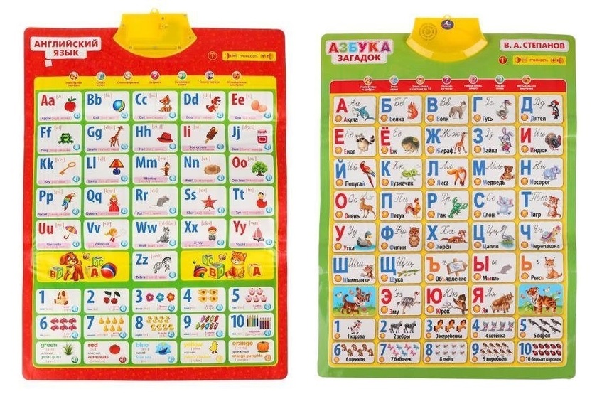 Обучающий плакат двусторонний "Азбука Русско-Английская" на бат. в кор.