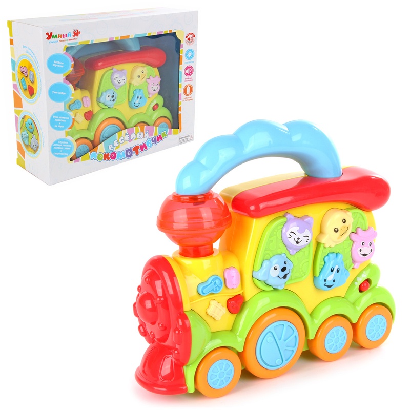 Веселый локомотивчик - очень полезная и нужная игрушка для развития малыша! Она столько всего умеет делать! Есть разные режимы: - можно учить цифры, нажимая на забавные мордочки зверушек; - изучать названия животных и знакомиться с тем, какие звуки они издают; - слушать забавные звуки (локомотив, гудок) и веселые мелодии. Игрушка поет песенку, обучает скороговорке, а еще ее можно использовать, как каталку! Громкость регулируется, дымовая труба подсвечивается. Игрушка развивает: - концентрацию внимания (малыш сосредотачивает свое внимание на одном деле и не отвлекается на посторонние); - сенсорное восприятие (яркие цвета тренируют визуальное восприятие и помогают научиться различать цвета); - слуховое восприятие (за счет прослушивания веселых мелодий, песенки и звуковых эффектов); - мелкую моторику (различные фактуры и формы помогают развитию тактильного восприятия, тренируя точность движений пальчиков и ручек); - зрительную и слуховую память малыша. Озвучка русская. Игрушка работает от 3 батареек АА, в комплект не входят. Изготовлена из высококачественной и прочной пластмассы. Размеры локомотивчика: 24,5*8*21,5 см. Размеры коробки: 29*10*22,5 см.