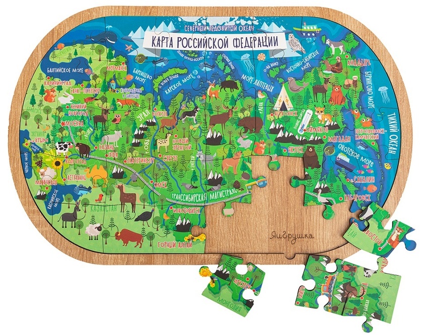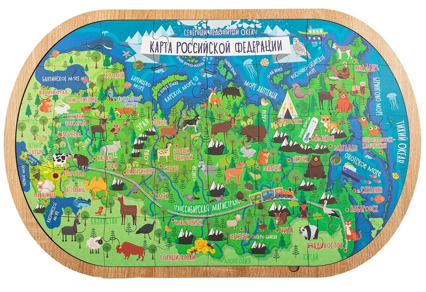 Увлекательный и познавательный деревянный пазл "Карта Российской Федерации" отправит Вашего малыша в захватывающее путешествие по нашей стране. Складывая фрагменты, необходимо собрать целую картинку. Когда ребенок правильно расположит 36 деревянных элементов, он узнает какие существуют города, моря и океаны, а также познакомится с разнообразной фауной. "Карта Российской Федерации" будет хорошим подспорьем для подготовки ребенка к школе. Крупные детали пазла удобные, яркие и изготовлены специально для детской ручки. Пазлы развивают: мелкую моторику рук; концентрацию внимания; цветовое восприятие и зрительную координацию; логическое и пространственное мышление; воображение, память и сообразительность; усидчивость и стремление добиваться конечной цели. Игрушка выполнена из натуральных отечественных материалов и соответствует стандартам безопасности и качества. Комплектность: рамка-основа, 36 элементов различной формы.