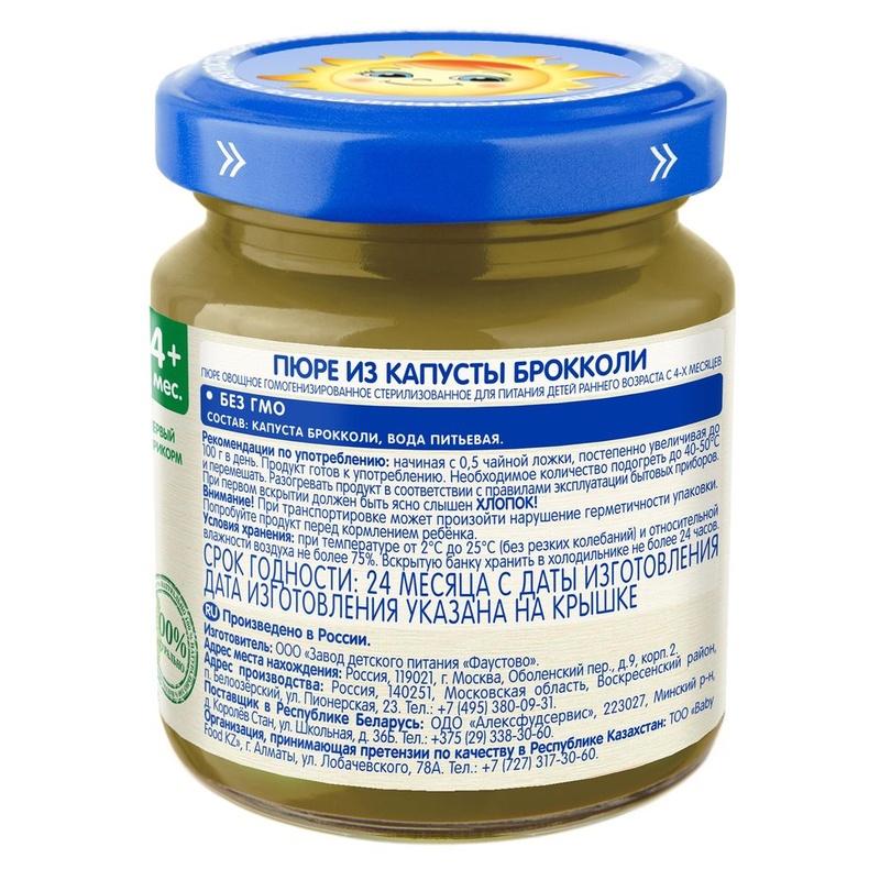 Нет в наличии ОтсутствуетБабушкино лукошко Пюре Брокколи с 4 мес., 100 г Пюре овощное гомогенизированное стерилизованное для питания детей раннего возраста Рекомендуется в качестве первого овощного прикорма. • - монопродукт • - без соли • - с 4 месяцев • - низкоаллергенный продукт Состав продукта Капуста брокколи, вода питьевая. Без ГМО. Без добавления соли. Рекомендации по употреблению Пюре рекомендуется употреблять начиная с 0,5 чайной ложки, постепенно увеличивая до 100 г в день. Продукт готов к употреблению. Необходимое количество подогреть до 40-50°С и перемешать. Разогревать продукт в соответствии с правилами эксплуатации бытовых приборов. Упаковка Продукт расфасован в стеклянные баночки массой нетто 100г. При первом вскрытии должен быть ясно слышен ХЛОПОК! Пищевая ценность В 100 г продукта: углеводы - 3,5 г; минеральные вещества: калий - 70-300 мг, энергетическая ценность - 15 ккал/ 60 кДж. Срок хранения Закрытая баночка хранится при температуре от +2°С до +25°С (без резких колебаний) и относительной влажности воздуха не более 75% в течение 24 месяцев с даты изготовления. Содержимое открытой баночки может храниться в холодильнике не более 24 часов. Полезные свойства Брокколи - низкоаллергенный продукт. Высокое содержание витамина С, фолиевой кислоты и железа улучшает кроветворение и способствует профилактике железодефицитной анемии. Укрепляет иммунитет. Бренд Бабушкино лукошко Страна-производитель Россия
