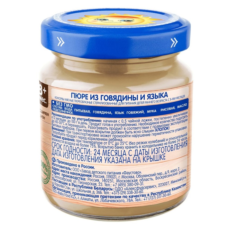 Бабушкино Лукошко Пюре говядина с языком с 8 мес. 100 г Пюре мясное пюреобразное стерилизованное для питания детей раннего возраста Мясные пюре с субпродуктами отличаются более насыщенной пищевой ценностью и очень полезны для подрастающих малышей. • - без соли • - с 8 месяцев Состав продукта Говядина, язык говяжий, мука рисовая, масло подсолнечное, вода питьевая. Без ГМО. Без добавления соли. Рекомендации по употреблению Пюре рекомендуется употреблять, начиная с 0,5 чайной ложки, постепенно увеличивая к 12 месяцам до 100 г в день. Продукт готов к употреблению. Необходимое количество подогреть до 40-50°С и перемешать. Разогревать продукт в соответствии с правилами эксплуатации бытовых приборов. Упаковка Продукт расфасован в стеклянные баночки массой нетто 100г. При первом вскрытии должен быть ясно слышен ХЛОПОК! Пищевая ценность В 100 г продукта: белки - 9,0 г; жиры - 9,0 г; энергетическая ценность - 120 ккал/500кДж. Срок хранения Закрытая баночка хранится при температуре от 0°С до +25°С (без резких колебаний) и относительной влажности воздуха не более 75% в течение 24 месяцев с даты изготовления. Содержимое открытой баночки может храниться в холодильнике не более 24 часов. Полезные свойства Мясное ассорти из говядины и языка - источник витамина Е, провитамина А, витаминов группы В, минеральных веществ (железа, меди, кальция, цинка и натрия). Язык богат питательными веществами, хорошо усваивается и нормализует пищеварение. Бренд Бабушкино лукошко Страна-производитель Россия