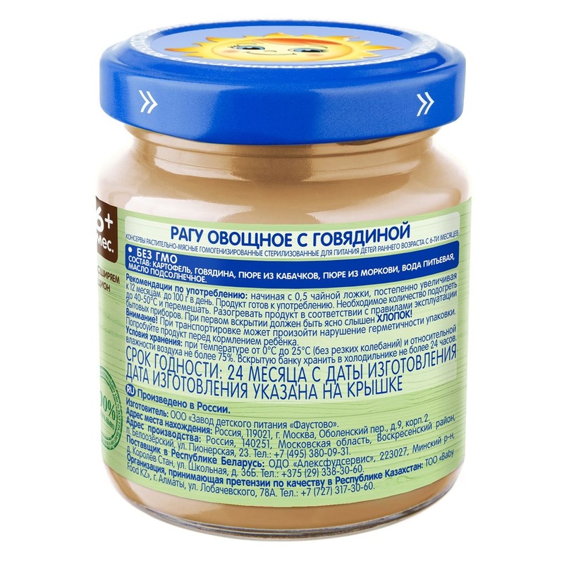 Бабушкино лукошко Пюре Говядина и овощи с 6 мес., 100 г Пюре растительно-мясное гомогенизированное стерилизованное для питания детей раннего возраста Благодаря оптимальному сочетанию мяса с овощами и крупами меню малыша всегда будет разнообразным и полноценным. • - без соли • - с 6 месяцев Состав продукта Картофель, говядина, пюре из кабачков, пюре из моркови, масло подсолнечное, вода питьевая. Без ГМО. Без добавления соли. Рекомендации по употреблению Пюре рекомендуется употреблять начиная с 0,5 чайной ложки, постепенно увеличивая к 12 месяцам до 100 г в день. Продукт готов к употреблению. Необходимое количество подогреть до 40-50°С и перемешать. Разогревать продукт в соответствии с правилами эксплуатации бытовых приборов. Упаковка Продукт расфасован в стеклянные баночки массой нетто 100г. При первом вскрытии должен быть ясно слышен ХЛОПОК! Пищевая ценность В 100 г продукта: белки - 3,5 г; жиры - 5,5 г; углеводы – 6,0 г; энергетическая ценность – 90 ккал/380кДж. Срок хранения Закрытая баночка хранится при температуре от 0°С до +25°С (без резких колебаний) и относительной влажности воздуха не более 75% в течение 24 месяцев с даты изготовления. Содержимое открытой баночки может храниться в холодильнике не более 24 часов. Полезные свойства Мясное рагу из говядины с овощами богато витаминами С, Е, РР, провитамином А, витаминами группы В (В1, В2, В6, В12). Говядина - источник животного белка, важных макро- и микроэлементов, которые способствуют гармоничному росту и развитию ребенка. Бренд Бабушкино лукошко Страна-производитель Россия