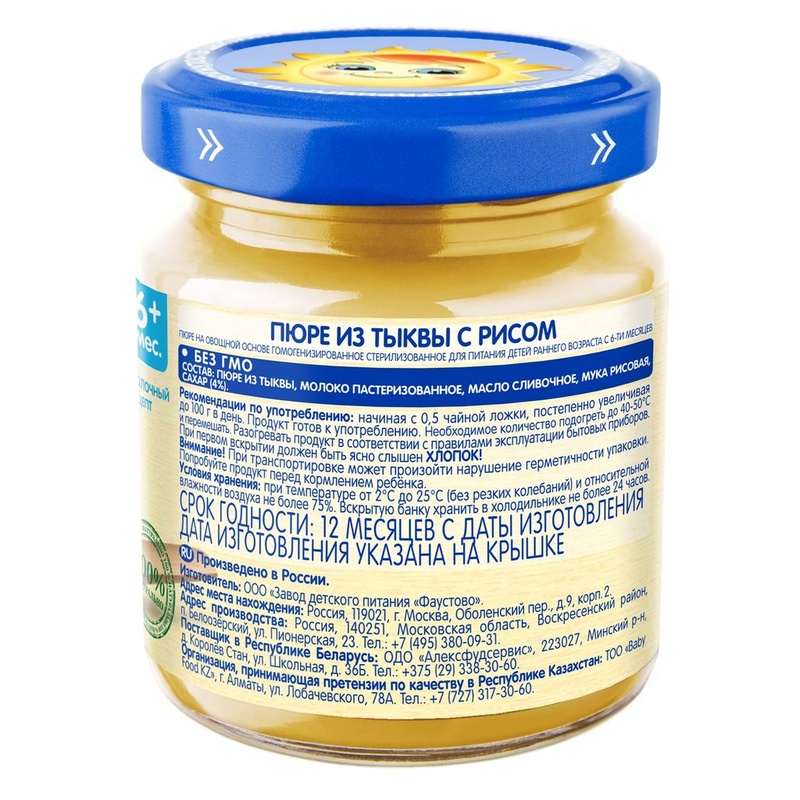 Бабушкино лукошко Пюре Тыква, рис, молоко с 5 мес., 100 г Пюре овощное гомогенизированное стерилизованное для питания детей раннего возраста Полезные и вкусные овоще-молочные пюре идеально подойдут для полдника вашего малыша. • - без соли • - с 6 месяцев Состав продукта Пюре из тыквы, молоко пастеризованное, масло сливочное, мука рисовая, сахар. Без ГМО. Без добавления соли. Рекомендации по употреблению Пюре рекомендуется употреблять, начиная с 0,5 чайной ложки, постепенно увеличивая до 100 г в день. Продукт готов к употреблению. Необходимое количество подогреть до 40-50°С и перемешать. Разогревать продукт в соответствии с правилами эксплуатации бытовых приборов. Упаковка Продукт расфасован в стеклянные баночки массой нетто 100г. При первом вскрытии должен быть ясно слышен ХЛОПОК! Пищевая ценность В 100 г продукта: белки - 1,5 г; жиры - 4,0 г; углеводы – 13,0 г; минеральные вещества: калий - 70-300 мг; энергетическая ценность – 95 ккал/400 кДж. Срок хранения Закрытая баночка хранится при температуре от +2°С до +25°С (без резких колебаний) и относительной влажности воздуха не более 75% в течение 12 месяцев с даты изготовления. Содержимое открытой баночки может храниться в холодильнике не более 24 часов. Полезные свойства Пюре Тыква-рис-молоко богато пектином и каротином, которые способствуют выведению вредных веществ из организма и улучшают состояние кожи и глаз. Входящий в состав пюре рис, мягко регулирует стул, уменьшая его частоту. Бренд Бабушкино лукошко Страна-производитель Россия