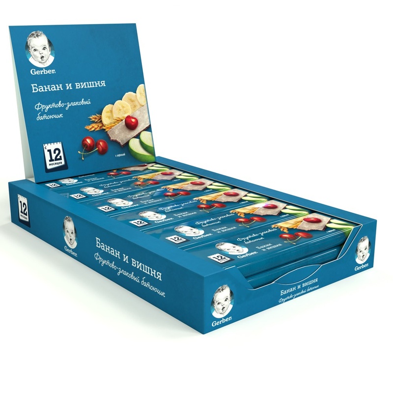 Gerber Фруктово-злаковый батончик с вишней и бананом 25 г. для питания детей старше 12 месяцев согласно законодательству РФ. ВАЖНОЕ ПРИМЕЧАНИЕ: идеальной пищей для грудного ребенка является молоко матери. Всемирная организация здравоохранения рекомендует исключительно грудное вскармливание в первые шесть месяцев и последующее введение прикорма при продолжении грудного вскармливания. Компания Нестле поддерживает данную рекомендацию. Для принятия решения о сроках и способе введения данного продукта в рацион ребенка необходима консультация специалиста. Изготовлено без использования генетически модифицированных ингредиентов, искусственных консервантов, красителей и ароматизаторов. Подходит для полезного и здорового перекуса между едой. Обогащен кальцием. Без добавления сахара. Натуральная сладость фруктов. Содержит 77, 6% фруктов. Состав: хлопья банана 39%, концентрированный яблочный сок 29%, концентрированный вишневый сок 9,6%, овсяные хлопья 5,7% (содержат глютен), кукурузные хлопья 5,3%, низкоэруковое рапсовое масло, мука (овсяная, пшеничная) 3,3% (содержит глютен), вафельная бумага (картофельный крахмал, оливковое масло), цитрат кальция. Продукт может содержать молоко, орехи, сою. Пищевая ценность (сред. состав на 100 г): энергетическая ценность - 357 ккал / 1509 кДж; белки - 3,4 г; углеводы - 74,6 г; жиры - 5,8 г; натрий - 30 мг; кальций - 244 мг; калий - 920 мг. Условия хранения: хранить при температуре от 0 до 35 C и относительной влажности не более 70%. Срок годности: 12 месяцев. Готов к употреблению. Рекомендуется давать данный продукт ребенку под присмотром взрослого. Меры предосторожности: Пожалуйста, давайте данный продукт ребенку под присмотром. Идеальной пищей для ребенка является молоко матери. Продолжайте грудное вскармливание как можно дольше после введения прикорма.