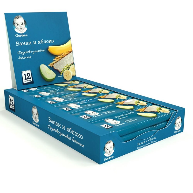 Gerber Фруктово-злаковый батончик с яблоком и бананом 25 г. для питания детей старше 12 месяцев согласно законодательству РФ. ВАЖНОЕ ПРИМЕЧАНИЕ: идеальной пищей для грудного ребенка является молоко матери. Всемирная организация здравоохранения рекомендует исключительно грудное вскармливание в первые шесть месяцев и последующее введение прикорма при продолжении грудного вскармливания. Компания Нестле поддерживает данную рекомендацию. Для принятия решения о сроках и способе введения данного продукта в рацион ребенка необходима консультация специалиста. Изготовлено без использования генетически модифицированных ингредиентов, искусственных консервантов, красителей и ароматизаторов. Подходит для полезного и здорового перекуса между едой. Обогащен кальцием и железом. Без добавления сахара. Натуральная сладость фруктов и злаков. Содержит 75,6% фруктов. Состав: Состав: хлопья банана 38,3%, концентрированный яблочный сок 37,3%, овсяные хлопья 6% (содержат глютен), кукурузные хлопья 5%, низкоэруковое рапсовое масло, рисовая мука - 3%, вафельная бумага (картофельный крахмал, оливковое масло), мальтодекстрин, цитрат кальция. Продукт может содержать молоко, орехи, сою. Пищевая ценность (сред. состав на 100 г): энергетическая ценность - 352 ккал / 1487 кДж; белки - 3,1 г; углеводы - 72,6 г; жиры - 5,9 г; кальций - 240 мг; калий - 800 мг. Условия хранения: хранить при температуре от 0 до 35 C и относительной влажности не более 70%. Срок годности: 12 месяцев. Готов к употреблению. Рекомендуется давать данный продукт ребенку под присмотром взрослого. Меры предосторожности: Пожалуйста, давайте данный продукт ребенку под присмотром. Идеальной пищей для ребенка является молоко матери. Продолжайте грудное вскармливание как можно дольше после введения прикорма. Рекомендации по приготовлению/использованию: Пожалуйста, давайте данный продукт ребенку под присмотром. Идеальной пищей для грудного ребенка является молоко матери. Продолжайте грудное вскармливание как можно дольше после введения прикорма. Необходима консультация специалиста.