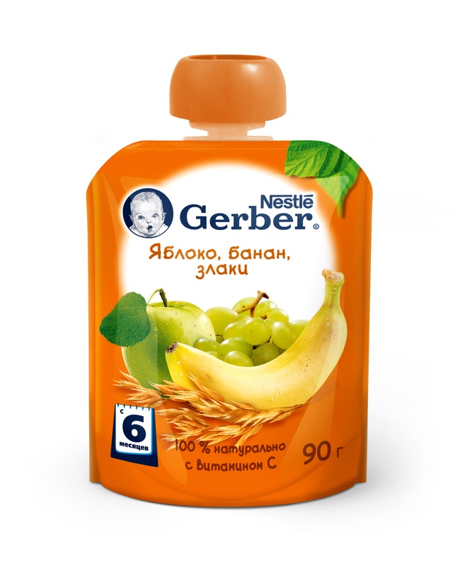 Нет в наличии ОтсутствуетGerber® (Гербер) Фруктовое пюре со злаками Яблоко, Банан, злаки 90 г. для питания детей старше 6 месяцев согласно законодательству РФ, в мягкой упаковке "пауч". ВАЖНОЕ ПРИМЕЧАНИЕ: идеальной пищей для грудного ребенка является молоко матери. Всемирная организация здравоохранения рекомендует исключительно грудное вскармливание в первые шесть месяцев и последующее введение прикорма при продолжении грудного вскармливания. Компания Нестле поддерживает данную рекомендацию. Для принятия решения о сроках и способе введения данного продукта в рацион ребенка необходима консультация специалиста. 100% натуральные фрукты. Изготовлено без использования генетически модифицированных ингредиентов, искусственных консервантов, красителей и ароматизаторов, крахмала и сахара. Состав: пюре из яблок (60 %), вода, пюре из банана (16 %), концентрированный виноградный сок (3 %), овсяные цельнозерновые хлопья (2,4 %) (содержат глютен), молотые пшеничные хлопья (1,5 %) (содержат глютен), концентрированный лимонный сок, витамин С (L-аскорбиновая кислота). Пищевая ценность (сред. состав на 100 г): энергетическая ценность - 68,4 ккал/286,4 кДж, белки - 0,9 г, углеводы - 13,6 г, жиры - 0,8 г, витамин С - 30 мг, калий - 160 мг. Условия хранения: до вскрытия хранить при температуре от 6 до 30 °C. Открытую упаковку хранить в холодильнике не более 24 часов. Внимание! не помещайте/не оставляйте крышечку в зоне доступа детей младше 36 месяцев. Если упаковка вскрыта или вздута, не используйте продукт. Срок годности: 12 месяцев. Начните кормление с 1 чайной ложки, постепенно увеличивая объем. Гомогенизировано. Пастеризовано. Готово к употреблению. Не разогревайте упаковку в микроволновой печи. Бренд: Gerber Страна: Польша