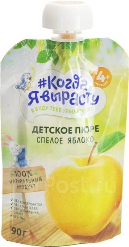 Когда Я вырасту Пюре Яблоко без сахара с 4 мес. 90г Фруктовое пюре Спелое яблоко - это сбалансированный и полезный детский десерт, рекомендован для питания детей старше 4 месяцев. Пюре - излюбленный перекус не только малышей и деток постарше, но и школьников, подростков, взрослых поддерживающих здоровый образ жизни. Удобная, современная упаковка - пауч, полностью сохраняет полезные свойства фруктов, занимает мало места в сумочке и холодильнике, её удобно брать в дорогу и на прогулку! Пюре производится на новейшем современном заводе с соблюдением высоких требований к качеству детского питания. Состав: пюре яблочное. Гомогенизированное, стерилизованное. Изготовлено из концентрированного пюре. Содержит сахара природного (естественного) происхождения. Рекомендации по употреблению: продукт готов к употреблению. Для питания детей старше 4-х месяцев, начинайте прикорм с 1 чайной ложки 2 раза в день, постепенно увеличивая к 12 месяцам до 100г. В оригинальной упаковке в микроволновой печи не разогревать. Не оставляйте ребенка одного во время еды без присмотра! Условия хранения: хранить не более 12 месяцев, при температуре от +2 до +25 °С и относительной влажности воздуха не более 75%. После вскрытия хранить в плотно закрытой упаковке в холодильнике не более суток. В случае употребления пюре ребенком из дозатора, продукт дальнейшему хранению не подлежит. Особенности: •способствует развитию вкусовых ощущений; •100% натуральный состав, полезный перекус; •без добавления сахара; •гомогенизированное, стерилизованное; •не содержит красителей, консервантов; •не содержит ГМО, крахмал; •пауч - удобно брать в дорогу / на прогулку; •можно кушать прямо из упаковки. Страна изготовления Сербия