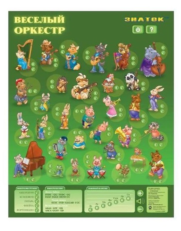 Звуковой плакат "Веселый оркестр" содержит информацию, звуки и изображения самых популярных музыкальных инструментов. Наряду с широко известными гитарой, арфой, контрабасом... Ребенок познакомится с ситаром, эрху, банджо. Всего 32 музыкальных инструмента. Предусмотрено несколько режимов работы: - Изучение: Около изображения каждого инструмента есть две кнопки. При нажатии одной из них воспроизводится краткая информация о музыкальном инструменте. При нажатии другой - звук этого инструмента. - Экзамен: При нажатии на кнопку предлагается проверить свои знания, ответив на вопросы. Дается две попытки, при отрицательном результате осуществляется переход к другому вопросу. Вопросы двух типов: показать музыкальный инструмент или определить, какой инструмент звучит. - Синтезатор звуков: Выбираете один из предложенных инструментов (аккордеон, ксилофон, гитара, флейта, фортепиано). Нажимаете на нотки-кнопки и создаете мелодию. На плакате приведены примеры игры трех песенок: Жили у бабуси, Чижик Пыжик, и Во поле береза стояла. Плакат имеет влагозащитную поверхность и может располагаться на столе или на стене. Для экономии батареек предусмотрено автоматическое выключение плаката при отсутствии активных действий в течение минуты. Предусмотрена регулировка громкости воспроизведения звуков. На плакате есть сенсорные кнопки: - Кнопки "Пояснение"- краткая информация о музыкальном инструменте. - Кнопки активации звука музыкального инструмента. - Кнопка "Экзамен": при нажатии на кнопку предлагается проверить свои знания, ответив на вопросы. Дается две попытки, при отрицательном результате осуществляется переход к другому вопросу. Синтезатор звуков: выбрав инструмент и нажимая на нотки-кнопки, можно воспроизвести не только предложенные песенки, но и другие мелодии.