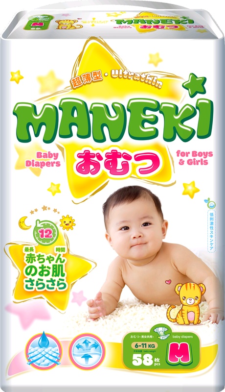 Ультратонкие гипоаллергенные подгузники и подгузники-трусики ТМ MANEKI изготовлены из высококачественных паропроницаемых материалов, сохраняют сухость ребенка до 12 часов и благодаря мгновенному и равномерному впитыванию абсорбент не сбивается в комки. Подгузники и подгузники-трусики ТМ MANEKI ультратонкие и при этом отлично - мгновенно впитывают, равномерно распределяют и надежно удерживают влагу внутри. В легких и воздушных трусиках и подгузниках малышу комфортно всегда. Бархатистый внешний слой дарит ощущение нежности при прикосновении. Используются самые передовые технологии при производстве нетканого материала для придания ему свойства нежнейшего хлопка. Подобранные пропорции состава впитывающего слоя (целлюлоза и впитывающий вкладыш) обеспечивают максимально тонкий слой Подгузников и Трусиков, без потерь в эффективности впитывания. Созданы для использования Днём и Ночью. Применяется суперабсорбент наивысшего качества, который обеспечивает максимальную впитываемость и удержание влаги внутри на долгое время. Надёжная защита от протекания. Уникальная система перфорации впитывающего слоя в виде ромбиков, обеспечивают максимальную скорость впитывания и равномерное распределение влаги. Высокий пояс защищает от протекания по спинке, а эластичные бортики-манжеты - от бокового протекания. Надежные застежки у подгузников и боковые швы у трусиков не повредят нежную кожу малыша. Индикаторы влаги быстрее подскажет уровень наполненности подгузника. С липкой полоской на задней стороне легче свернуть и утилизировать использованные трусики. Милые рисунки на трусиках и подгузниках понравятся и маме, и малышу, а пастельные тона будут незаметны под одеждой. В подгузниках и подгузниках-трусиках ТМ MANEKI удобно маме и комфортно малышу.