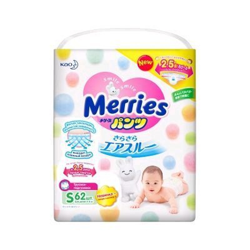 Теперь “дышащие” трусики Merries и для самых маленьких! Ваш малыш растет и становится все более активным. Он весело смеется и агукает, учится управлять своим телом — шевелит ручками и ножками, предпринимает первые попытки к переворачиванию на бок. В этот период менять подгузники уже не так легко, поэтому Merries предлагает для активных малышей использовать трусики-подгузники. Трусики Merries размера S (4-8 кг) легко надевать, и они не протекают, даже когда малыш лежит. Уникальные особенности трусиков размера S: Удлиненный впитывающий слой в задней части трусиков предотвращает протекание, даже когда ребенок лежит на спинке. Более широкий впитывающий слой по всей области между ножек обеспечивает более надежное впитывание мочи и жидкого стула. Merries заботится о коже вашего ребенка! Уникальная технология трех “дышащих” слоев отлично выводит прелый воздух из подгузника, что позволяет попке малыша всегда оставаться сухой и предотвращает появление опрелостей и раздражений на нежной коже. Слой 1. “Дышащая” волнистая внутренняя поверхность. Испарения выводятся наружу за счет свободного прилегания волнистого материала к коже малыша. Слой 2. Теперь воздушные каналы даже во впитывающем слое. Благодаря блочной структуре внутренний слой активно впитывает мочу и выпускает испарения наружу. Слой 3. Внешний “дышащий” материал. Внешний слой отводит влажный воздух через специальные микропоры, которые не пропускают влагу, но выпускают прелый воздух. Надежный впитывающий внутренний слой. Благодаря блочной структуре впитывающего слоя трусики впитывают большой объем жидкости, не увеличиваясь значительно в размерах и не мешая движениям малыша. “Дышащая” волнистая внутренняя поверхность надежно задерживает жидкий стул. Углубления на поверхности задерживают жидкий стул: это предотвращает его растекание внутри подгузника и минимизирует контакт с кожей. Мягкий эластичный пояс не давит на животик и не оставляет следов. Растягивается в 2,5 раза, что позволяет легко сменить трусики, даже когда малыш лежит. Воздушный и шелковистый внутренний слой понравится даже самой нежной коже. Мягкая поверхность приятна на ощупь и защищает кожу от натирания. Мягкий боковой шов не натирает и не жмет. Инновационный ультразвуковой метод соединения боковых швов делает шов более мягким, а разрывать его теперь ещё легче. Оборочки вокруг ножек предотвращают протекание. Плотно облегают ножки и отлично держатся даже на подвижном ребенке. Оборочки дополнительно удерживают жидкий стул от вытекания наружу. Индикатор наполнения. Если две центральные полоски индикатора окрасились в голубой цвет — значит, пора менять трусики. Лента для утилизации. Удобно свернуть в трубочку и закрепить использованные трусики лентой для утилизации. Симпатичный дизайн с зайкой Merries подарит малышу хорошее настроение. Подходит для мальчиков и девочек. Впитывающий слой располагается по всей поверхности трусиков-подгузников, поэтому трусики подходят и мальчикам, и девочкам. Материал: нетканый полиолефин, полиолефин-нетканый полиэстер, распушенная целлюлоза, бумага, полимер-суперабсорбент, полиолефиновая пленка, полиуретан, термоклей.