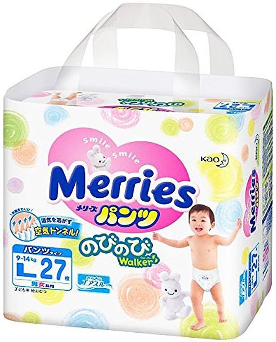 Merries Подгузники-трусики L (9-14 кг) 27 шт. Вес ребенка: 9-14 кг Кол-во в упаковке: 27 шт Японская компания Као является одним из наиболее популярных в Японии производителей товаров гигиены для детей. Производимые этой компанией детские подгузники Merries по праву являются лучшим выбором для Вашего ребенка. •Подгузники-трусики Merries удобны в период обучения малыша к горшку, они надеваются и снимаются, как настоящие трусики, поэтому ребенок очень скоро научится пользоваться ими самостоятельно. •Трусики Merries изготовлены из чистого хлопка, гладкого как шёлк и очень мягкого на ощупь. •Специально разработанная «дышащая» поверхность трусиков позволяет ребёнку чувствовать себя сухо и комфортно. •Трусики идеально подходят для сна, длительных прогулок и поездок. •Они мягко облегают тело малыша, не стягивая талию и не сдавливая кожу. •Трусики снабжены системой side up (впитывание по бокам), которая предохраняет их от протекания, сколько бы ребёнок не двигался. •Длина индикатора наполнения увеличена сзади, для легкого определения время замены трусиков. •Полоски изменили свой цвет? Меняйте подгузник!
