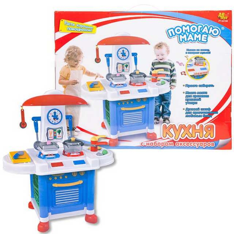 Детская игровая кухня из серии "Помогаю маме" - это замечательный набор, который станет прекрасным подарком для юного повара! В комплект входит миниатюрная кухня и соответствующие аксессуары к ней (12 предметов). Набор приятно порадует ребенка изобилием различных столовых приспособлений, звуковым сопровождением, яркой расцветкой и качеством изготовления. При повороте ручки включается подсветка, слышен звук готовки (бульканье воды, жарка). Из крана льется вода. В набор входит посуда (нож, разделочная доска, кастрюлька и т.д.), продукты, а также книга рецептов (под часами). Кухня выполнена из высококачественной пластмассы, абсолютно безвредной для здоровья. Размер в собранном виде: 43*30*63 см Инструкция не требуется. Работает от 3- х батареек типа АА (не в комплекте).