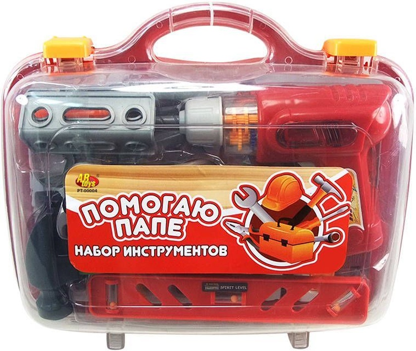 Игровой набор инструментов из серии "Помогаю Папе" - необходимый элемент в игровой комнате каждого мальчика. Игрушки с ранних лет научат малыша первичным навыкам работы с инструментами. Все инструменты изготовлены из качественного пластика, поэтому абсолютно безопасны для игры. Мальчик сможет наблюдать за папой и повторять все его действия, но уже с помощью своего набора "Помогаю папе". Набор из 26 предметов, в чемодане, в котором удобно носить и хранить инструменты. Комплектация: 2 бруска, уровень, молоток, линейка, дрель эл/мех, отвертка, пассатижи, гаечный ключ, 2 соединительные планки, 2 скобы, 3 гвоздя, 4 болта, 4 гайки, бейджик, очки.