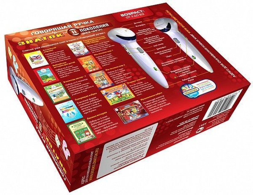 Нет в наличии ОтсутствуетДля мальчиков и девочек Цвет: белый. Комплект: говорящая ручка, сетевое зарядное устройство, USB-кабель, ремешок, книжка с аудиостикерами. . Из чего сделана игрушка (состав): пластик, металл, текстиль. . Размер упаковки: 31 х 22.5 х 10 см. Упаковка: картонная коробка. Длина ручки: 17 см. Диаметр подставки: 6.5 см. Длина ремешка: 40 см. Память ручки: 4 GB. Вес : 450 г. Страна обладатель бренда: Россия. "Ручка" от компании "Знаток" - это интересное электронное говорящее изделие, предназначенное для развития речевых способностей и памяти ребенка. В комплекте можно найти ремешок, подставку, зарядку и Usb-шнур. Ручка оснащена картой памяти 4 ГБ, в которой есть более 10 типов книг. Стоит коснуться концом ручки логотипа на обложке книги "Говорящая ручка" и она начнет воспроизводить сохраненные в ней файлы. Можно перелистывать книгу и касаться ею картинок или текста. Ручка также оснащена функциями Mp3-плеера и диктофона с разъемом для наушников и Usb-входом. В комплекте можно найти несколько аудиостикеров, на которые можно сделать звуковые записи. Внимание! Книги для воспроизведения данной ручкой с логотипом "Говорящая ручка" необходимо приобрести отдельно.